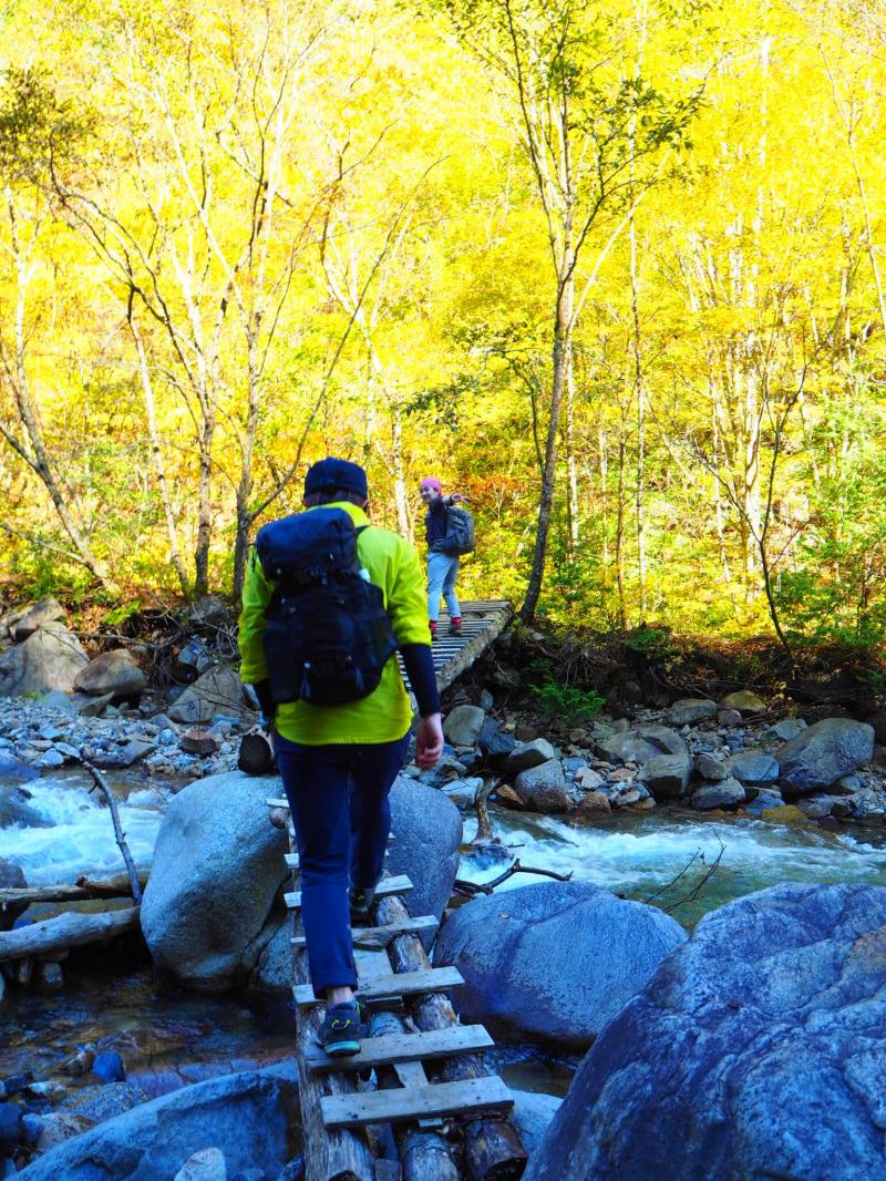 登山口すぐの渡渉点にある木の橋は、増水時に渡れなくなる場合もありますので注意してください。