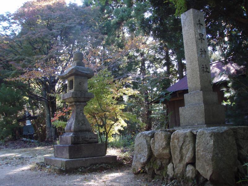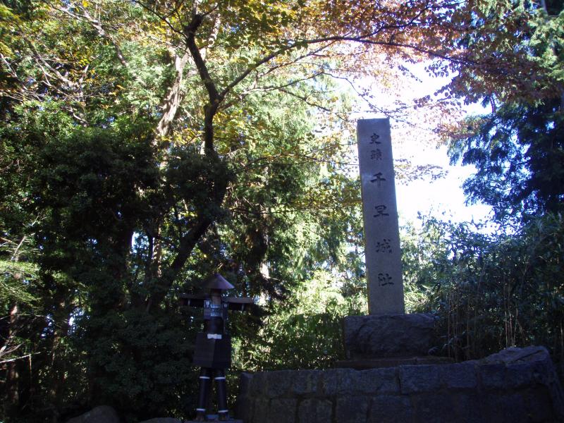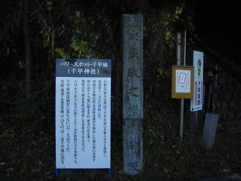 千早城址に造られた千早神社に参拝。「千早城址は絶対に落ちないパワースポット」との看板があり。受験、選挙、企業業績などで困った時にお参りすると、効果があるかもしれません。城址から金剛山への登山道を歩いていくと、左手に楠木正儀の墓(楠公首塚説もあり)あり。