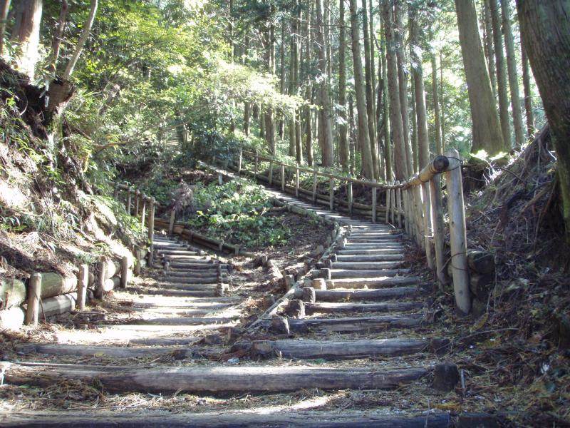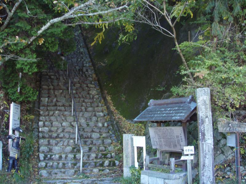 バス停・金剛登山口から出発。千早城登山口(大手口)から入山し、まずは城址へ。100日間も戦い続け、幕府軍を撃退したという難攻不落の城だったことから想像はしていたものの、最初から五百数十段の急な階段の道は結構堪えます…。気温は約10度でしたが、汗ばむぐらいの運動量でした。