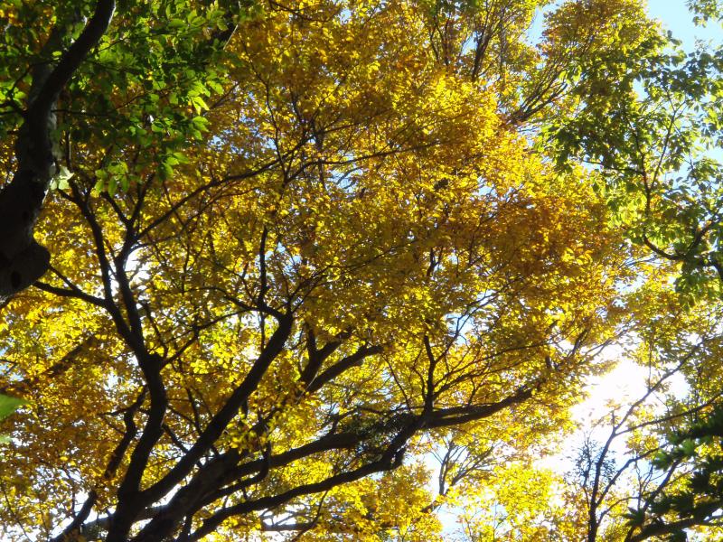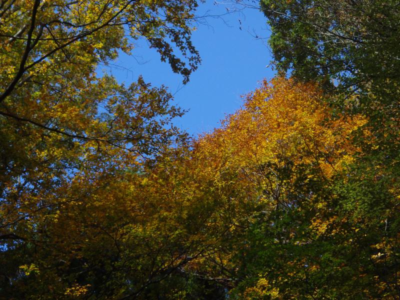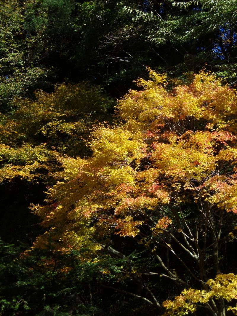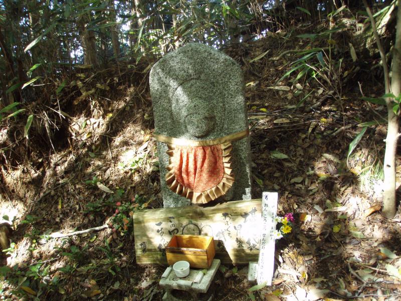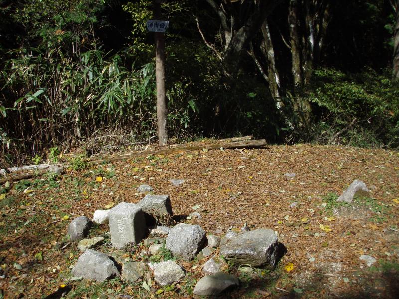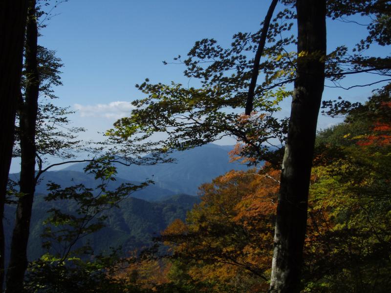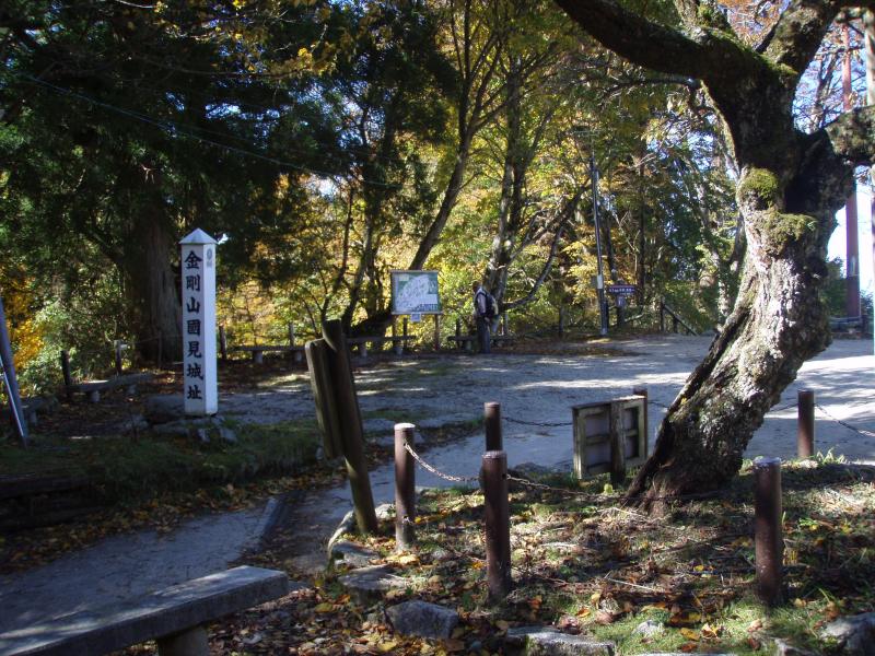 整備された階段の道沿いには所々に地蔵があり、単調な山道に変化を与えてくれています。8合目ぐらいから、所々で紅葉が始まっていました。出発から100分ぐらいで、正成の城のひとつである國見城址に到着。展望の良い山頂広場があり、陽当たりも良いので、昼食にオススメの場所です。