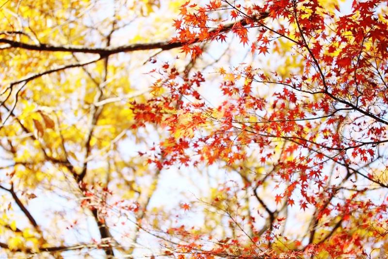 山崎駅から見る山のふもとは美しい紅葉です。天気も良く、気持ちのよい紅葉ハイクのスタートです。途中から グリーンの森に変わります。