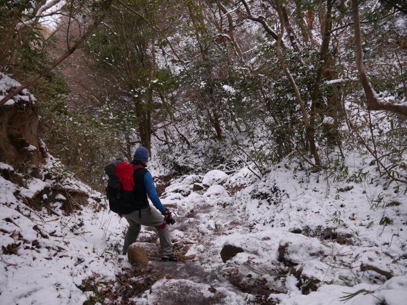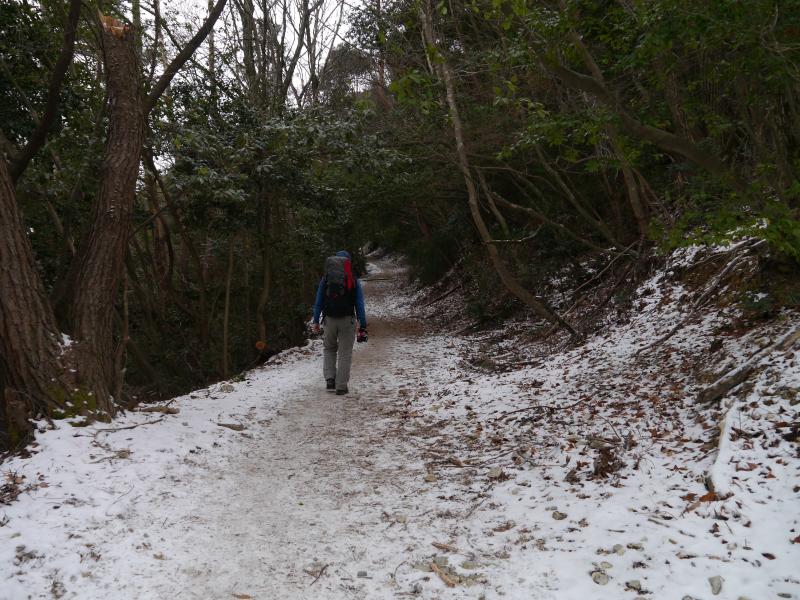 ・下山は山上部から西に進み石切道を選びました。ここも10cm程度の積雪が中腹まであり滑りやすいです。