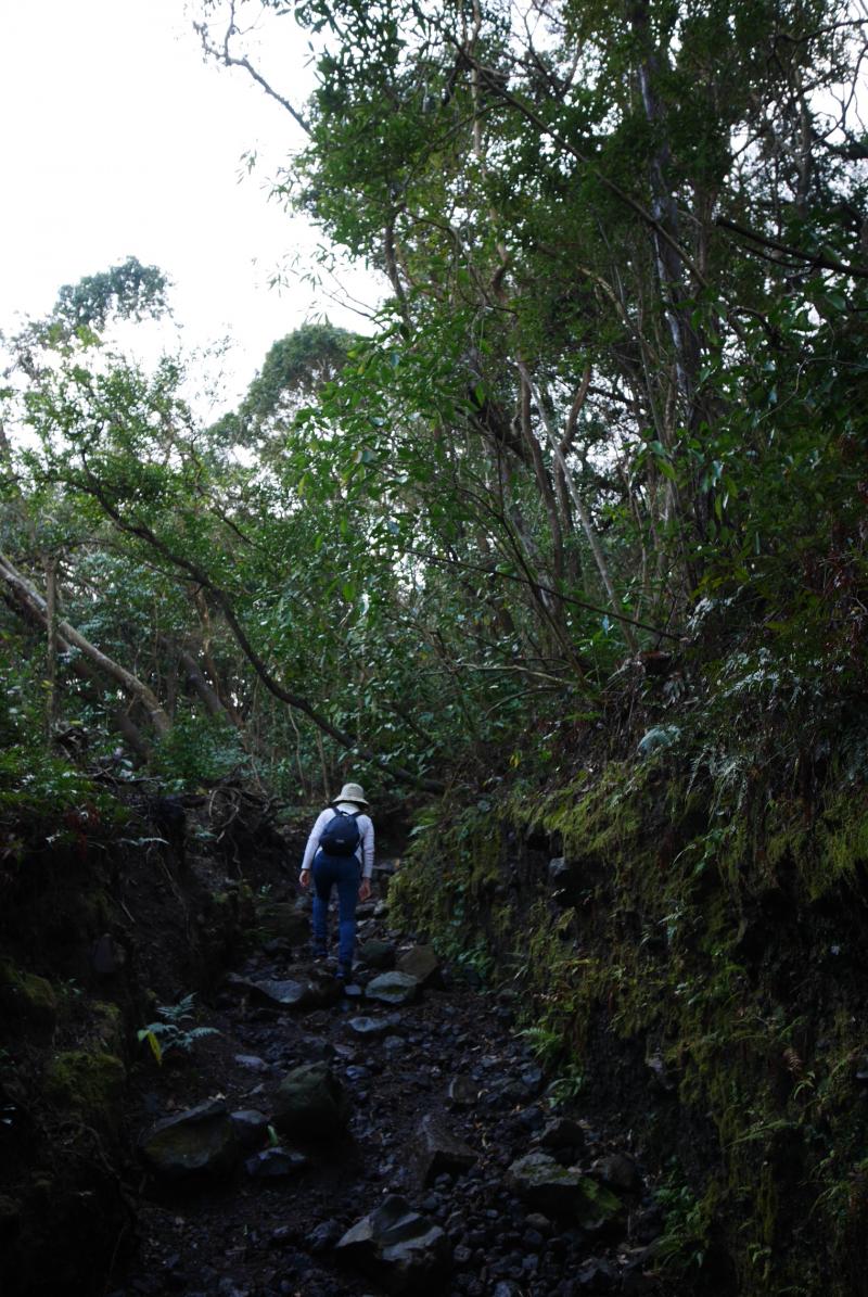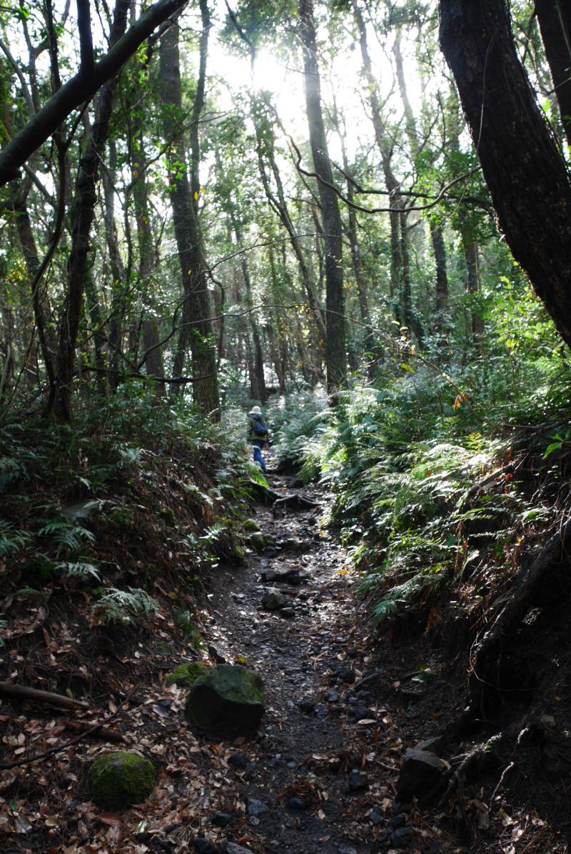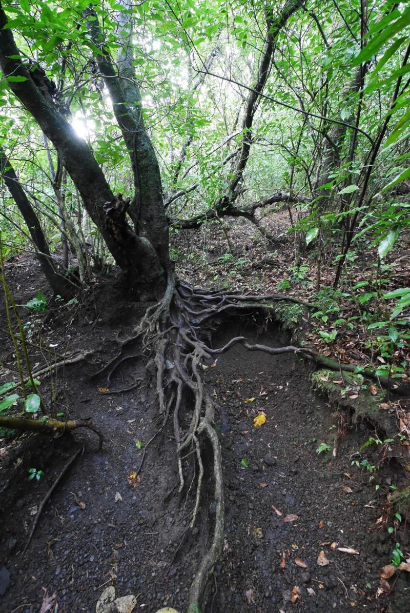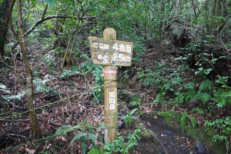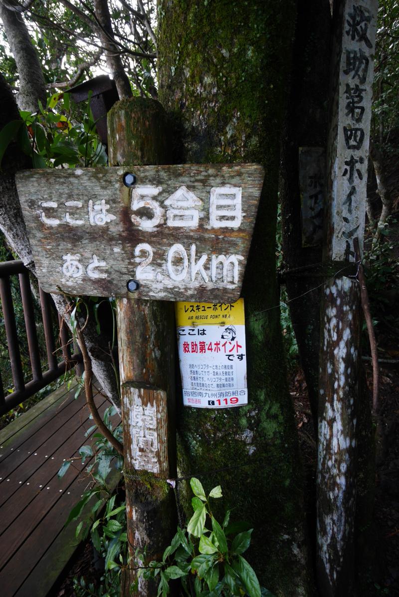 10時過ぎに到着すると開聞岳の半分から上はグレーの湿っぽい雲にすっぽりと覆われ、風もすこし吹いていそうだったので行けるところまで行こうと思い、展望のある5合目を目指すことにしました。道は迷うところはありませんがザレていて滑りやすく、また木の根っこなども多く南国風のワイルドな雰囲気。雨あがりだったのでさらに滑りやすくなっていて、標高差もなかなかあるので前日5時半起きだった身体にはすこしきつく感じました。同行していた母親もいつもよりバテていたので、雲はなくなり晴れていましたが5合目で引き返すことにしました。