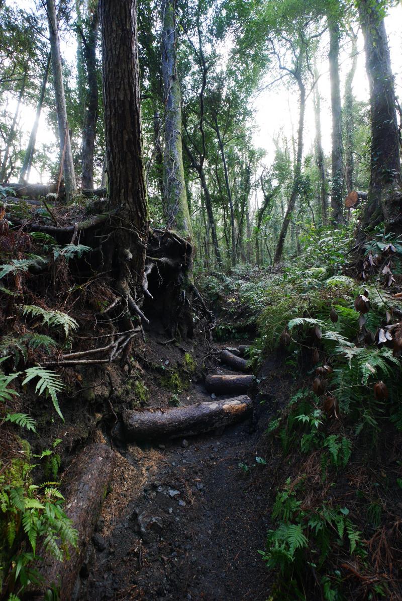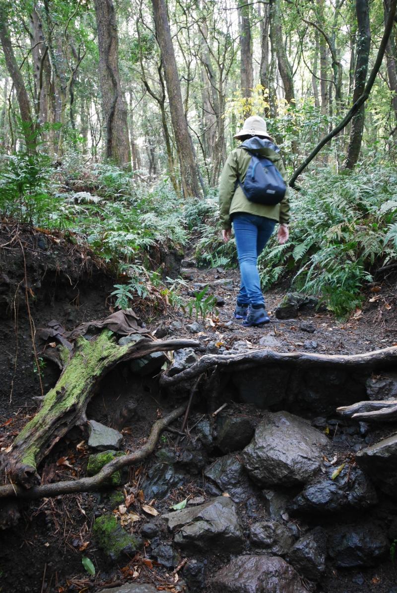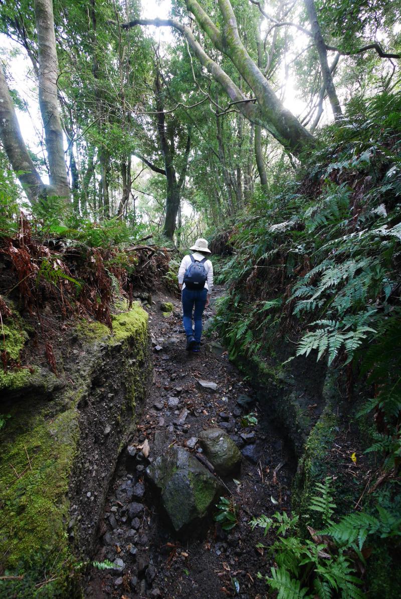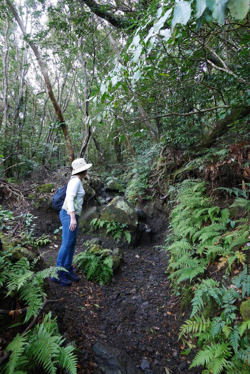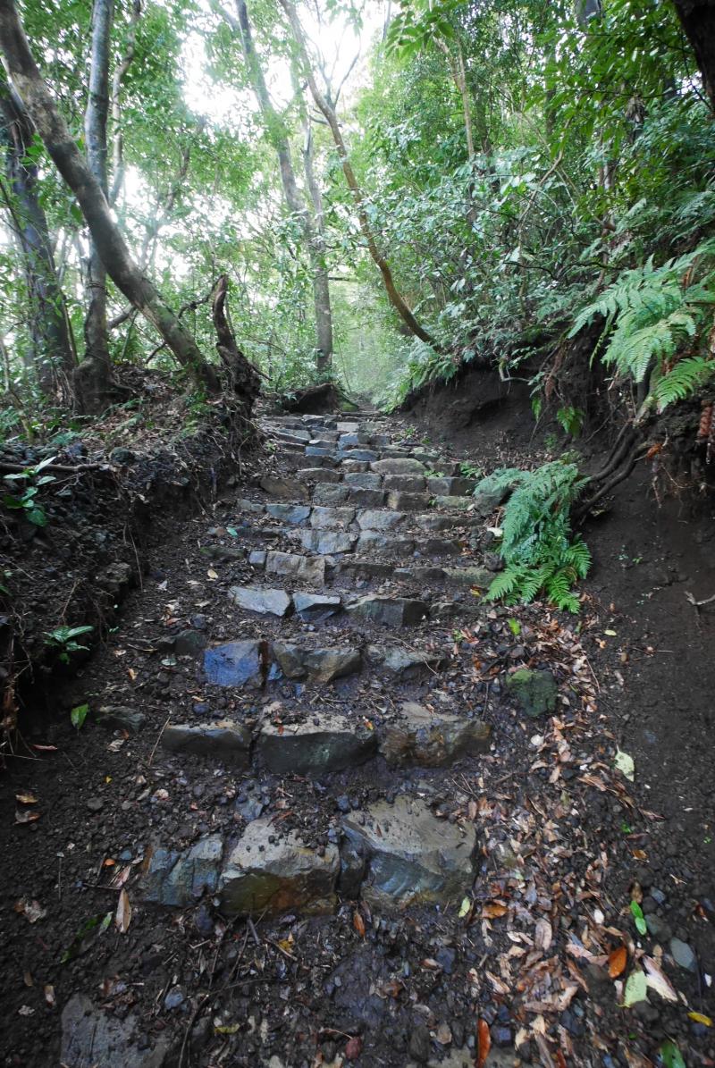 10時過ぎに到着すると開聞岳の半分から上はグレーの湿っぽい雲にすっぽりと覆われ、風もすこし吹いていそうだったので行けるところまで行こうと思い、展望のある5合目を目指すことにしました。道は迷うところはありませんがザレていて滑りやすく、また木の根っこなども多く南国風のワイルドな雰囲気。雨あがりだったのでさらに滑りやすくなっていて、標高差もなかなかあるので前日5時半起きだった身体にはすこしきつく感じました。同行していた母親もいつもよりバテていたので、雲はなくなり晴れていましたが5合目で引き返すことにしました。