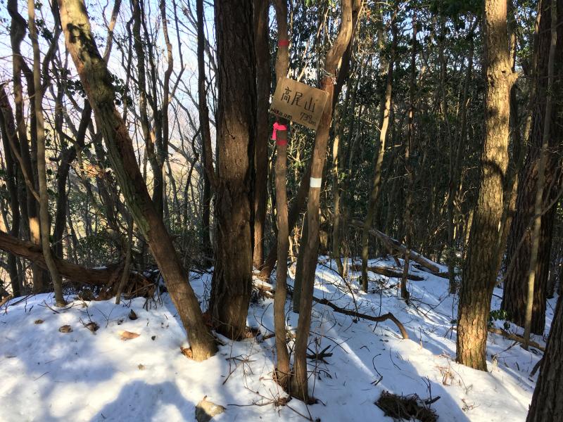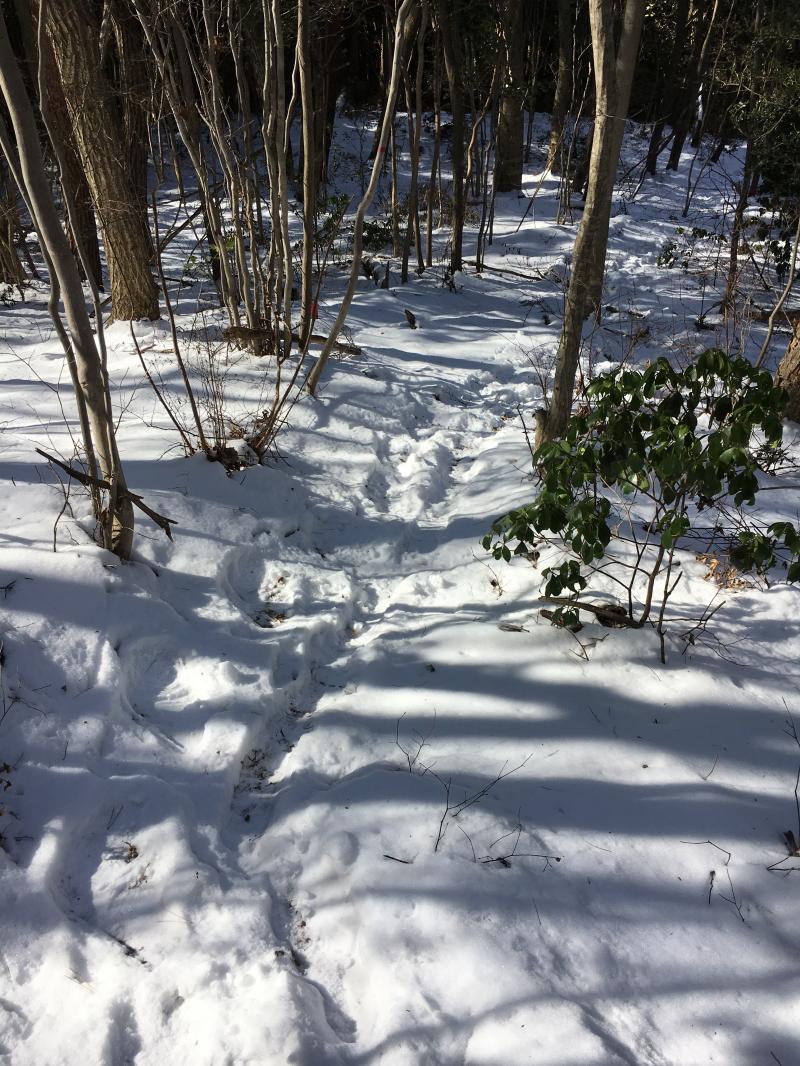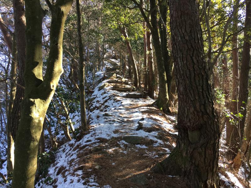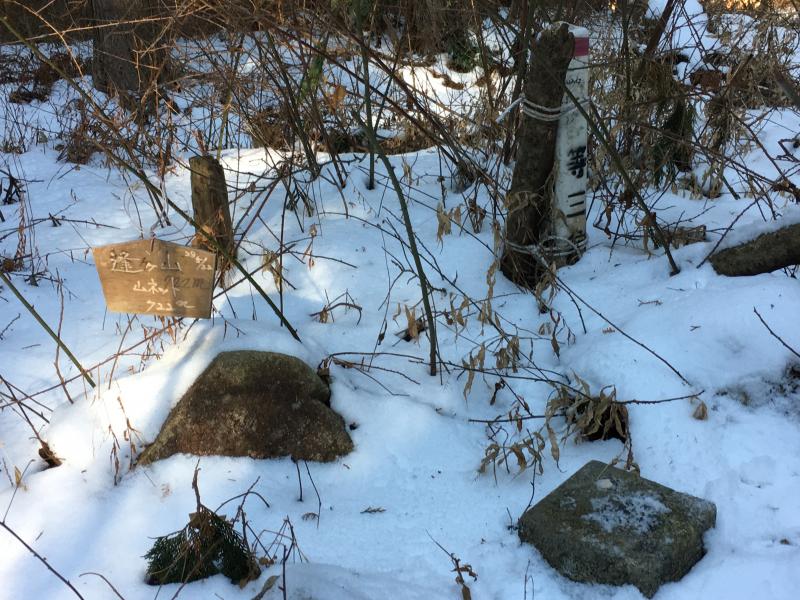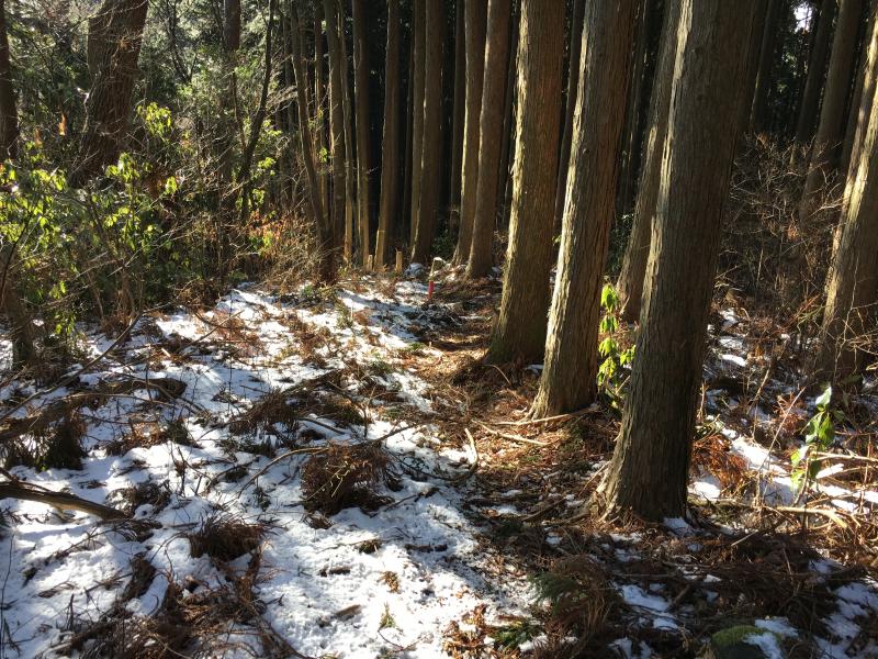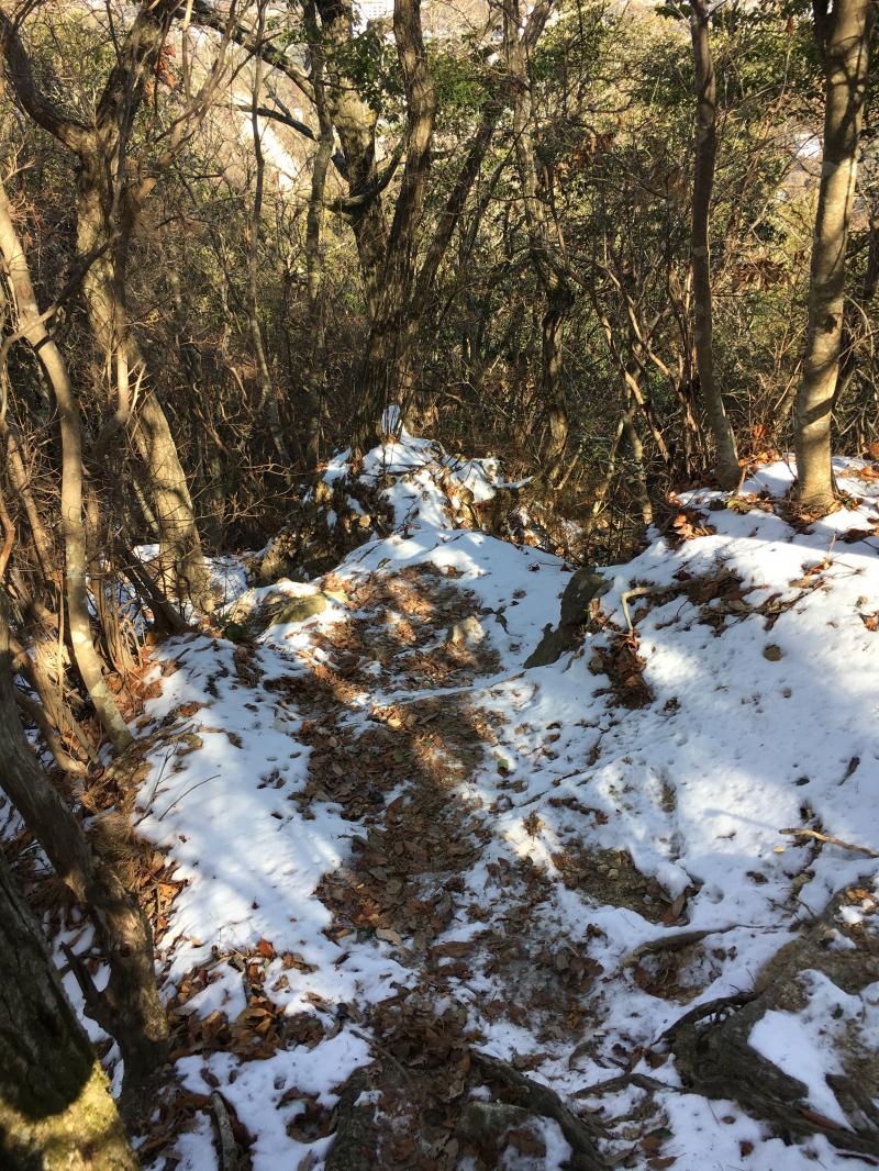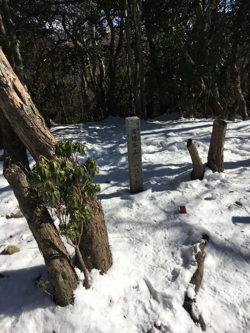 道はいたるところで凍り付いており、土道もカチカチ。標高500m位から上は薄いながらもべったりと雪が貼りついていました。念のため6本爪のアイゼンを持っていましたので早々に装着。湯槽谷山手前の急登か滑りやすく、アイゼンなしでは危ない感じでした。