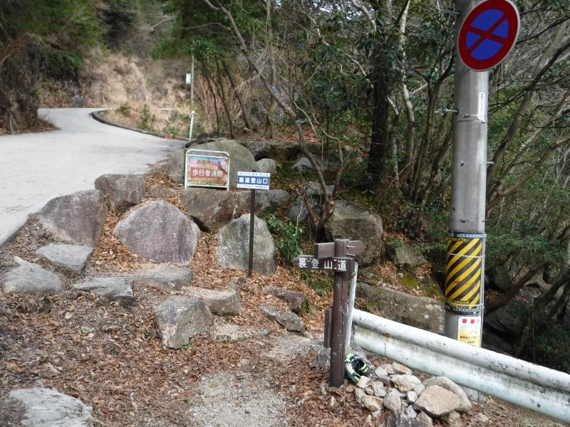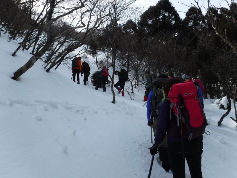 集合場所の湯の山温泉駅~裏道登山口は雪もなく、普通の登山道を冬靴で歩きます。普段の登山靴よりも硬くて歩きにくく感じた方も多かったようです。