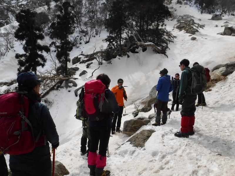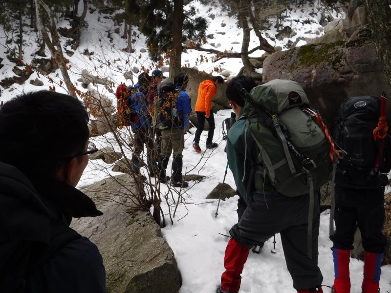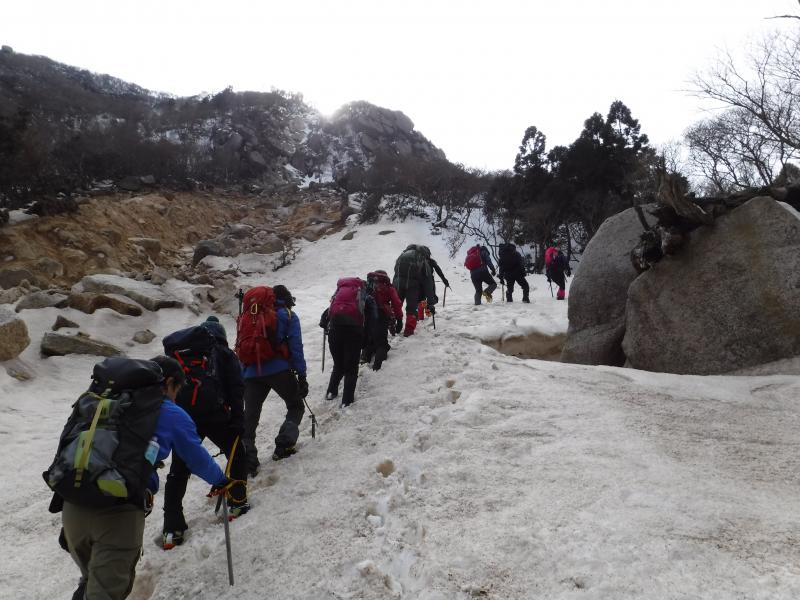 しかし、アイゼンを付けて歩くために必要な歩行技術を身に付けるためにも、藤内壁出合まではアイゼンなしで登りました。