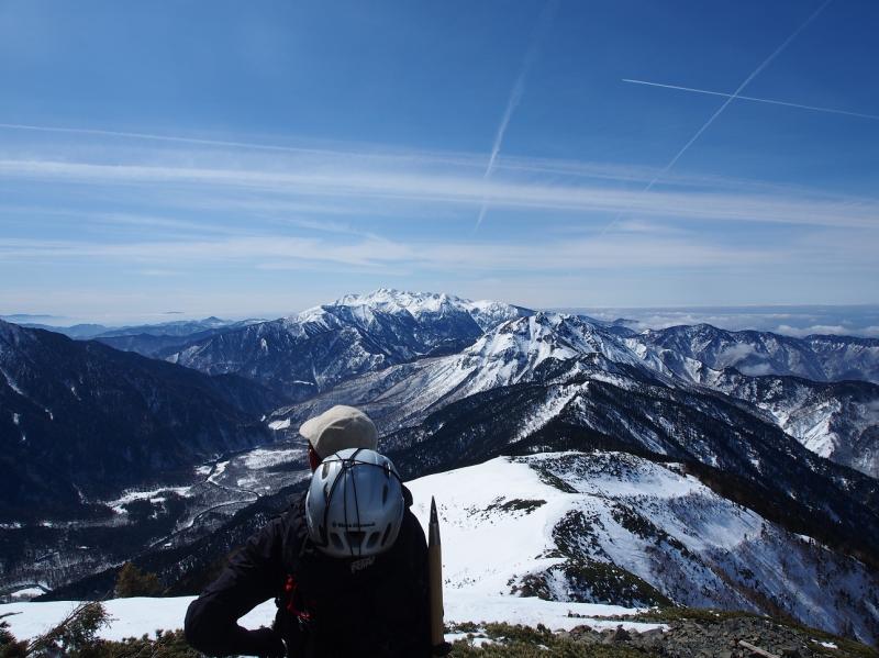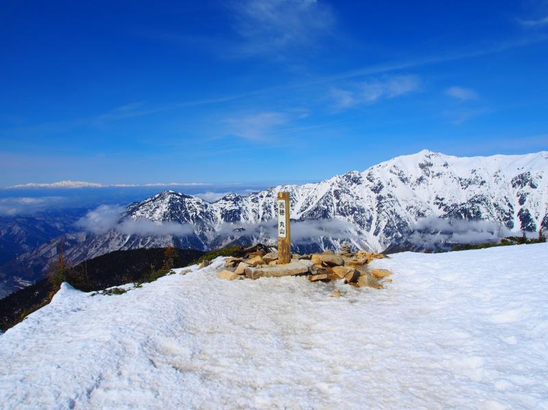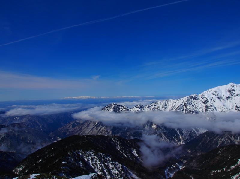 前方には西穂や奥穂。振り返ると焼岳・乗鞍。遠くには八ヶ岳や南アルプス、白山と最高の景色。