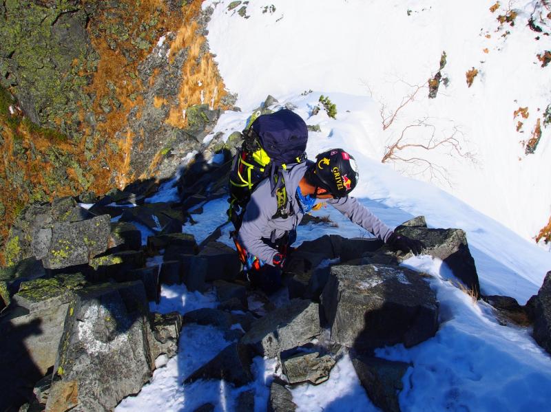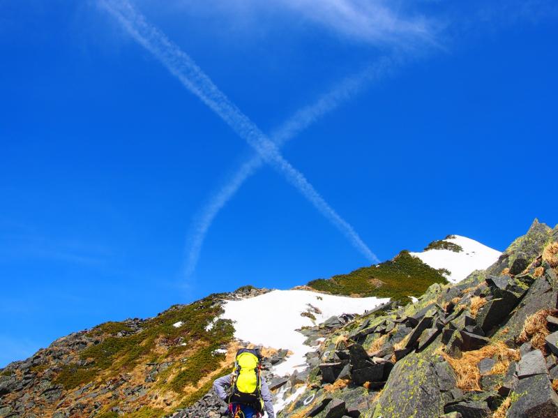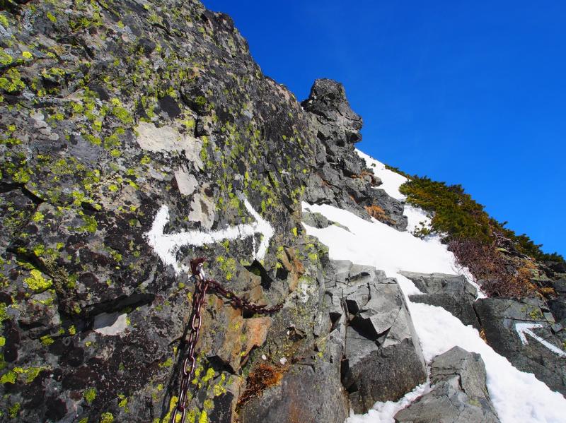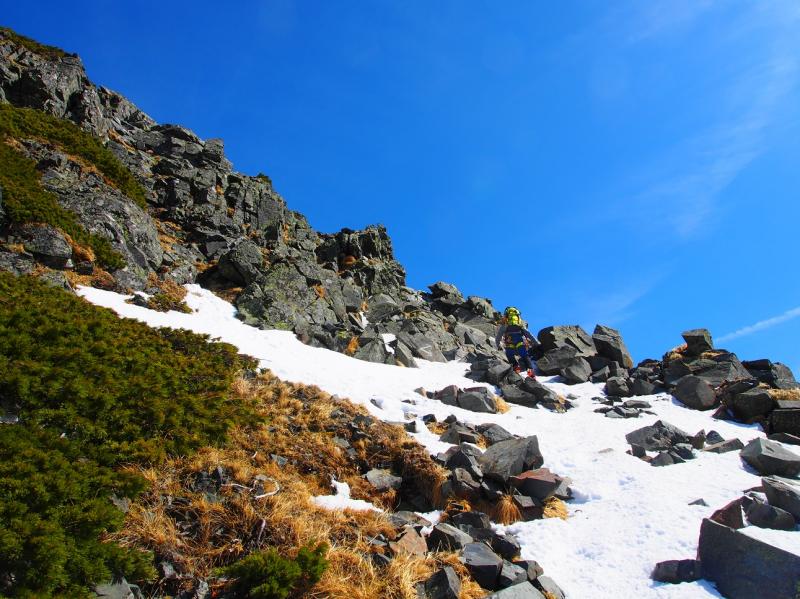 - トレース有りで歩きやすいが、この日は雪も少なく、気温が上がるにつれてシャリ雪でアイゼンが効きにくい。風もなく、雪も少なく、道に迷うことはないが、独標直下は岩が露出し、アイゼンで引っかかりやすいので注意が必要。