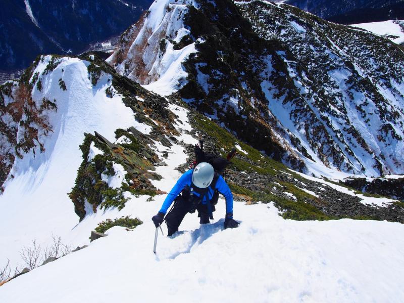 稜線も徐々に険しい道。雪が少なくアイゼンが効きにくいところもあり、慎重に歩きました。