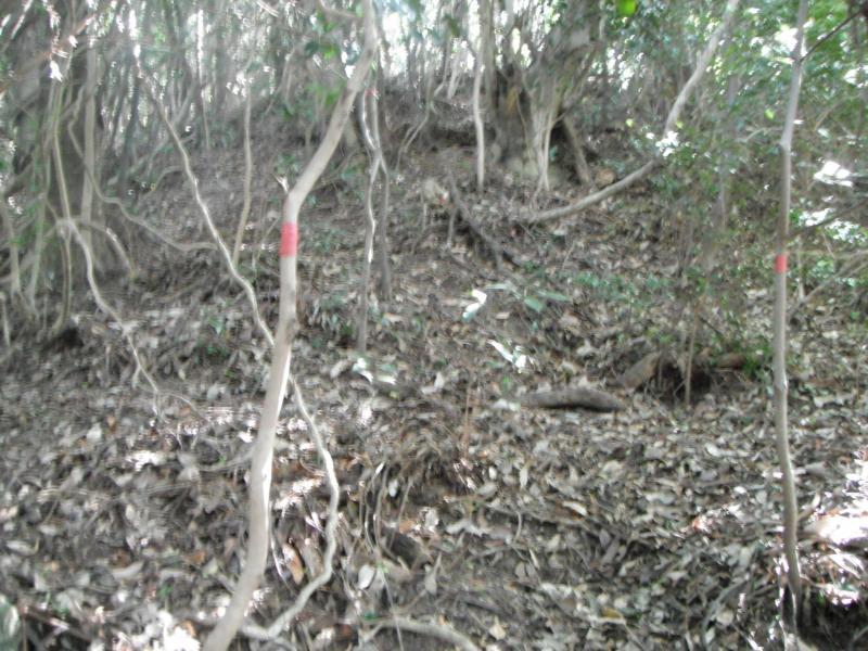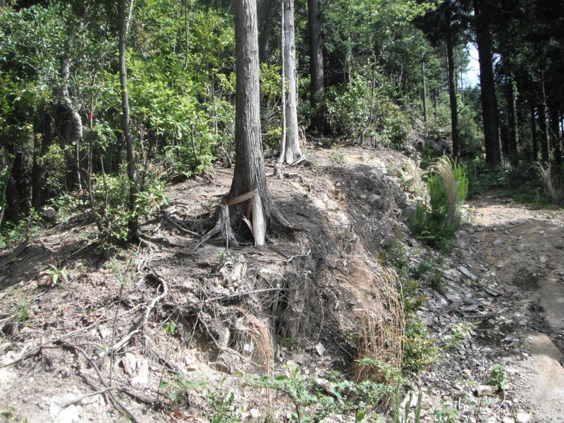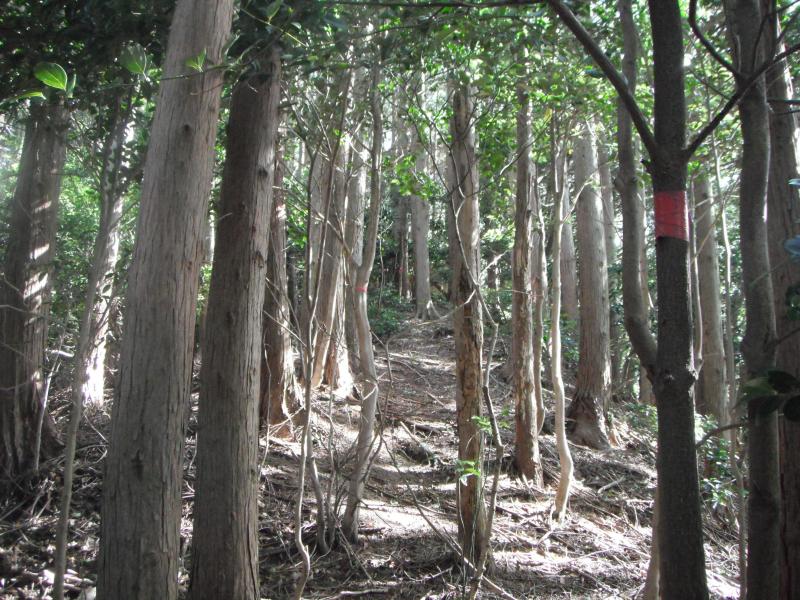 ほっとする間もなく急登に取り組みます。時々現れる緩い登りで息を吐きながら踏み跡とテープをたどり、落ち葉で踏み跡が隠されていればコンパスで進路を確認し、忠実に尾根を辿っていきます。割と明瞭な尾根なのが救いです。途中作りかけの林道のような場所に出ますが、尾根方面に続く目印テープを追っていくと649ピーク。名もないピークですが三角点があります。ここから程なく林道に出、砥石山登山口へ。昭和の森から林道を辿ってもここに来ることができます。