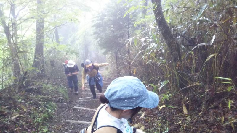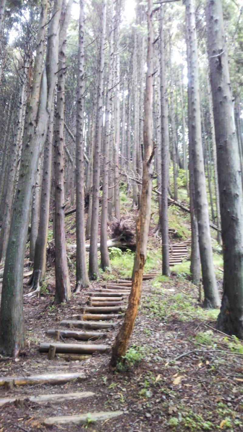 特に迷うような道もなく歩きやすい道が続きますが、はじめの30分位は登りが辛く感じるかもしれません。話しながらゆっくり登ればあっという間に穂積神社に到着。トイレはここの1カ所のみです。穂積神社の鳥居をくぐり裏手に回ると大きな夫婦杉を発見。そのまま進むと階段が長く続きました。登り切ったところで薬師岳に到着。そのまま進みあっという間に文殊岳に到着。竜爪山はこの二つの峰からなる双耳峰で、町からもよく見えます。