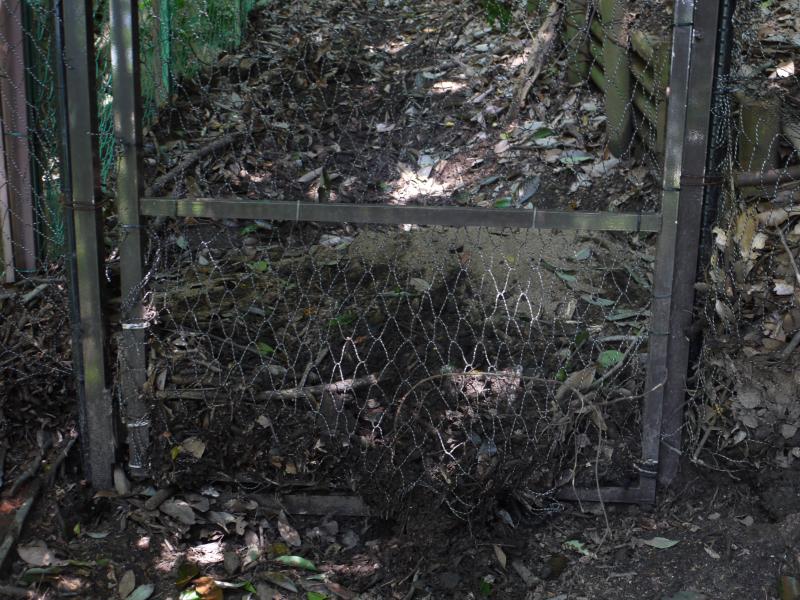 ・まず登ろうと考えた天神谷東尾根登山口の獣よけゲートに枯れ枝、落葉、土砂が溜まりゲートが開かないため、先に進めずあきらめました。