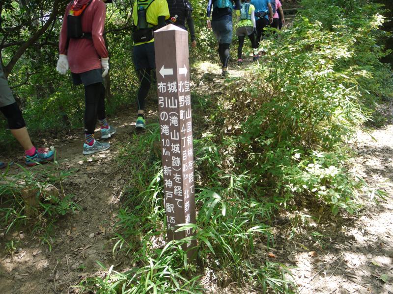 - JR三ノ宮駅(私鉄各線神戸三宮駅)(20分)ハンター坂=天神谷東尾根登山口<獣よけゲート解放不能のためコース変更>(15分)北野天満神社東側登山口(45分)城山方面からの分岐(7分)二本松林道出合(15)善助茶屋跡(15)修法ヶ原(15)大龍寺山門(10)市ヶ原~迂回路~(20)布引貯水池(20)新神戸駅