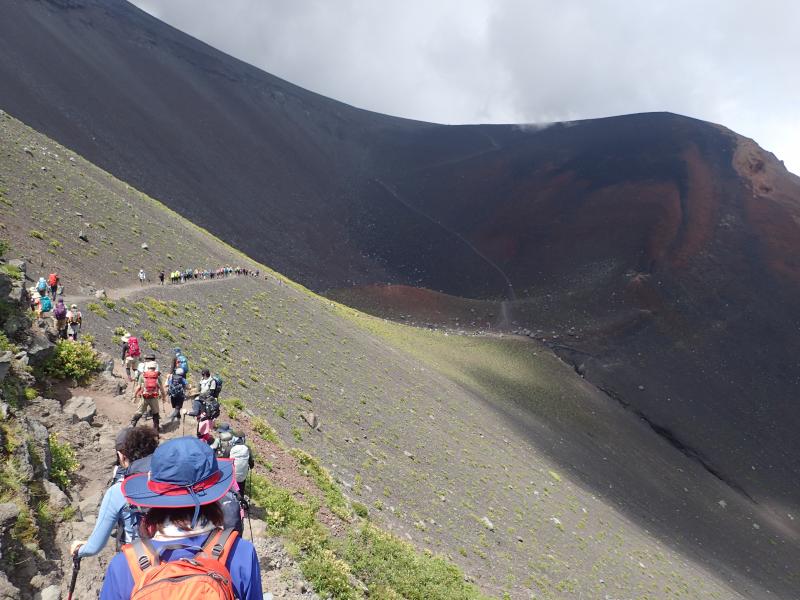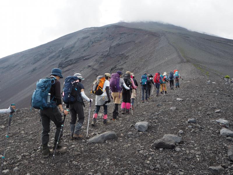 腹ごしらえして再び出発、ここでも見えているのに着かない苦しい思いをしながらジグザグ登りを繰り返し、ようやく見えてきた頂上鳥居。フィナーレは皆様静かにしみじみと感じているようでした。御朱印をゲットする人、剣ヶ峰まで出かける人、山頂で思い思いに過ごした後は、名残惜しくもちょっと面倒な下山タイム。前日に配ったゴンテックステーピングを早速使ってくださった方もいらっしゃったので、いつもよりは楽に下れたでしょうか?