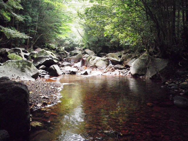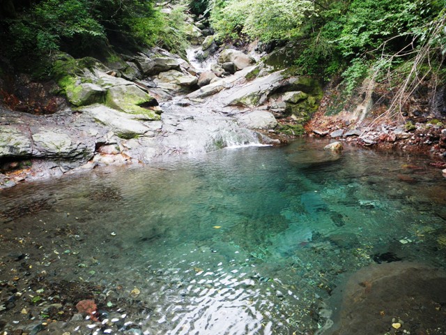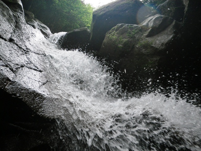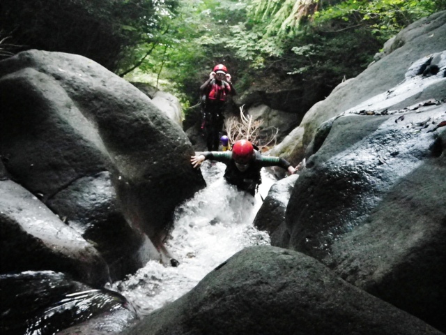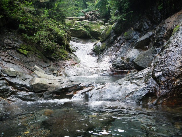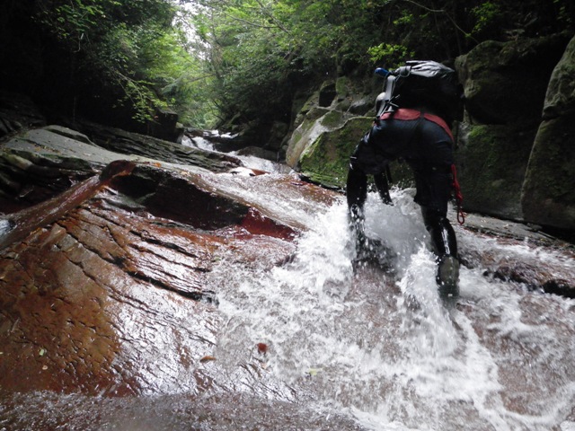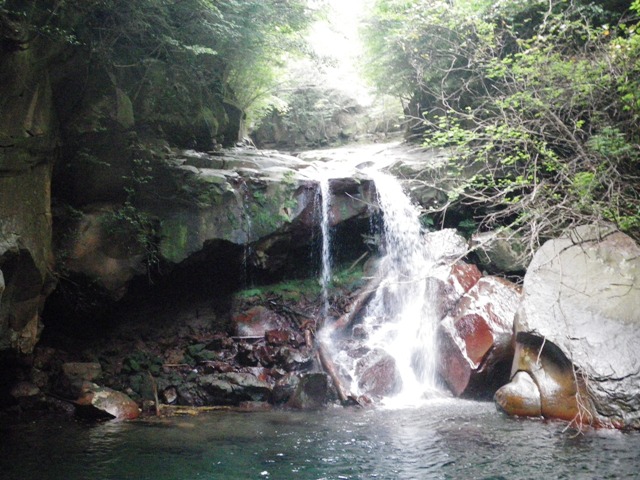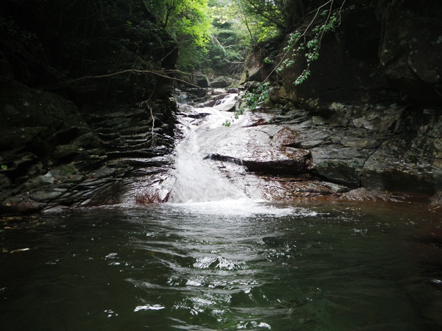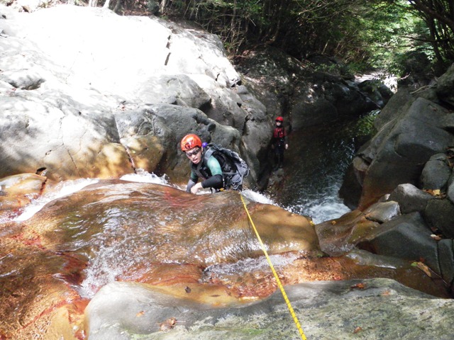 下流部に較べると滝の落差が大きくなるので、初心者にはロープの補助が必要でしょう。