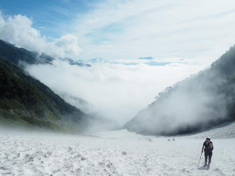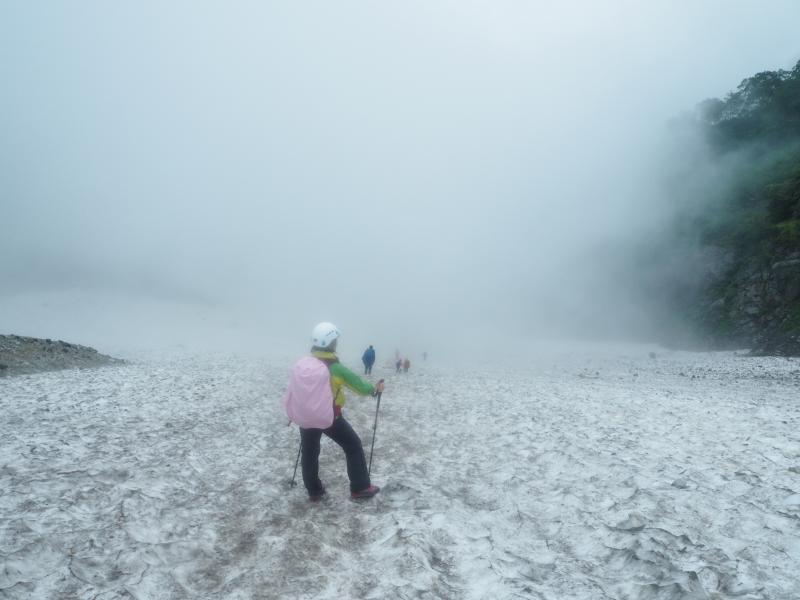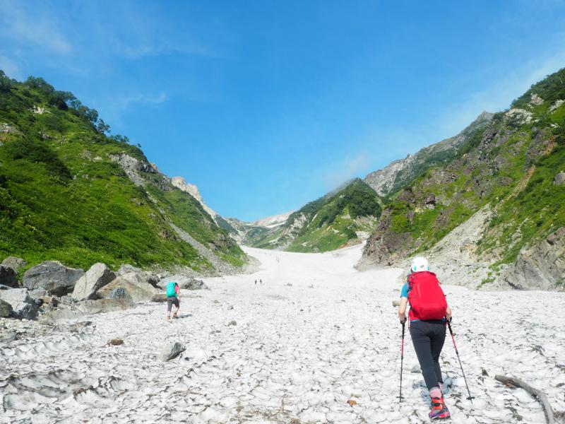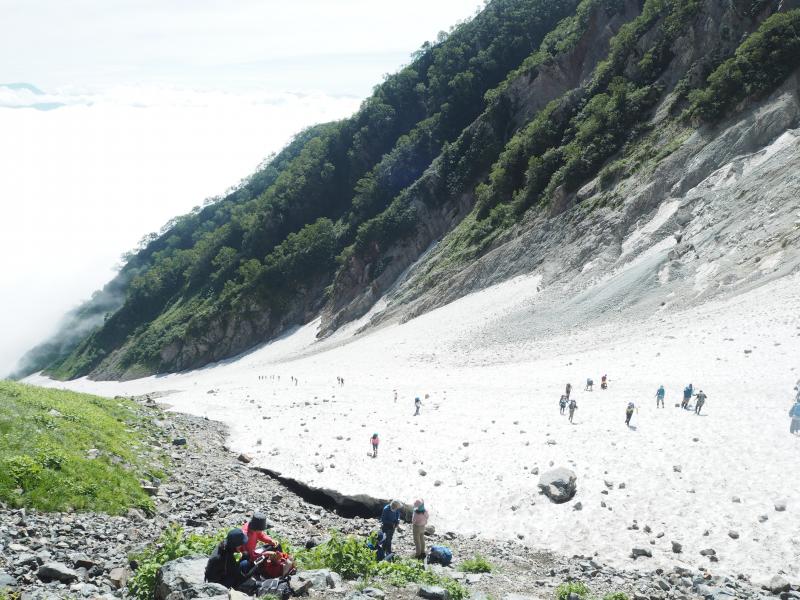 下りの雪渓では軽アイゼンがあると安心です。