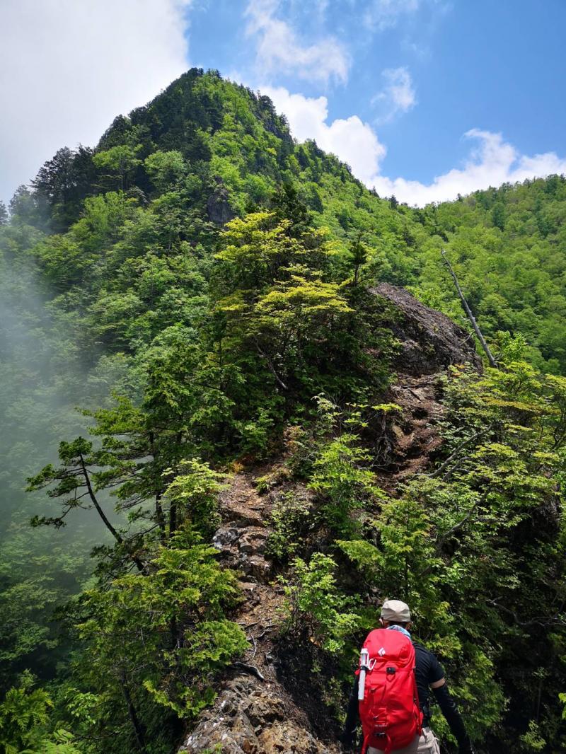 さぁ下りだスピード上げるよ!!というところからは、やせ尾根のやばい感じの下り。