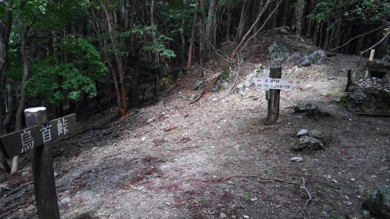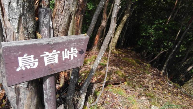 鳥首峠の看板から峠までは急坂の下りです一部虎ロープあります
