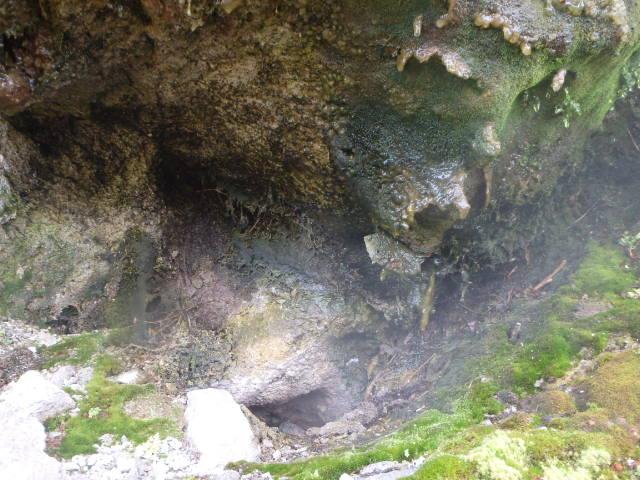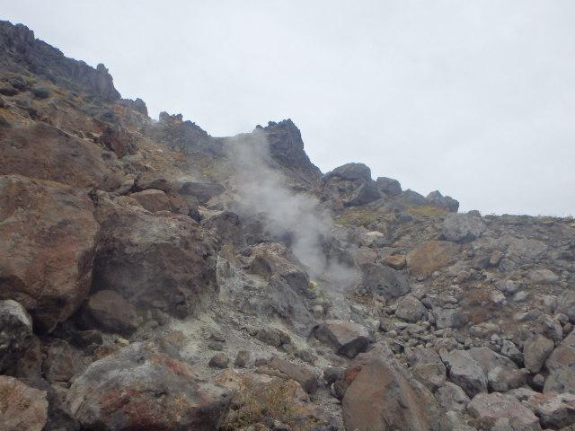 山頂付近で所々岩の間から蒸気がでていて暖かい場所があります。