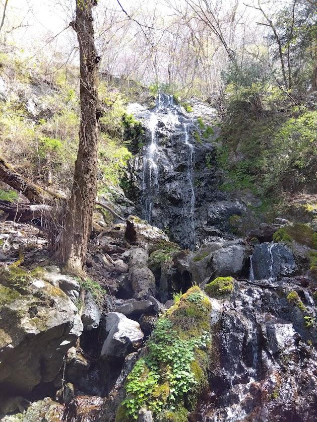 荒れまくったナンチャッテ林道を進んでいると、突然正面に白いカーテンのような大滝が現れ、度肝を抜かれます。