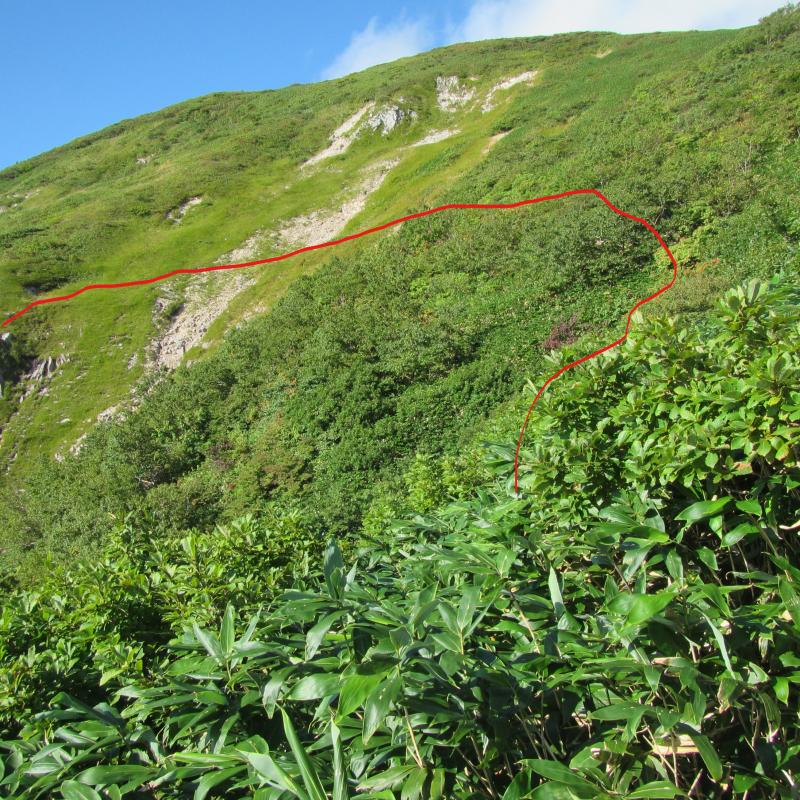 とにかく上を目指せば、藪漕ぎはなさそうですが、草付きの滑りやすい斜面の直上も結構大変。