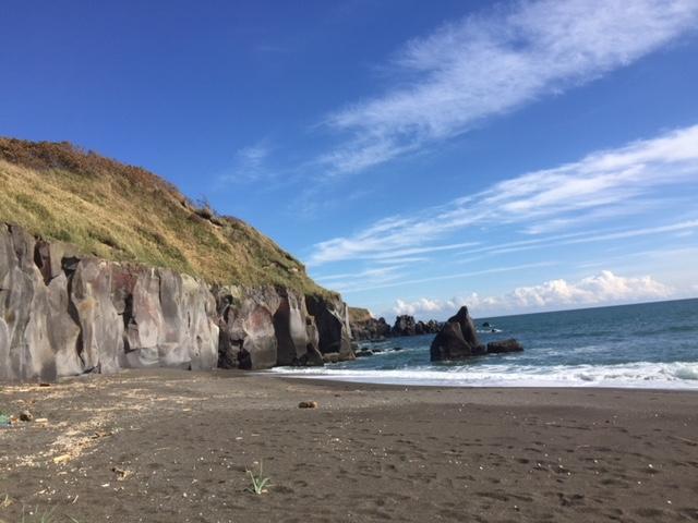 駐車スペースから平坦な砂浜を3分くらいですぐに岩がある。