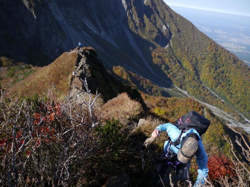 ・中宝珠越から上宝珠越は切れ落ちた岩場の通過、ロープが張られた急斜面や大きな段差が連続します。時々眼前に広がる大山北壁や、中腹の紅葉が素晴らしい三鈷峰が疲れを吹き飛ばしてくれます。