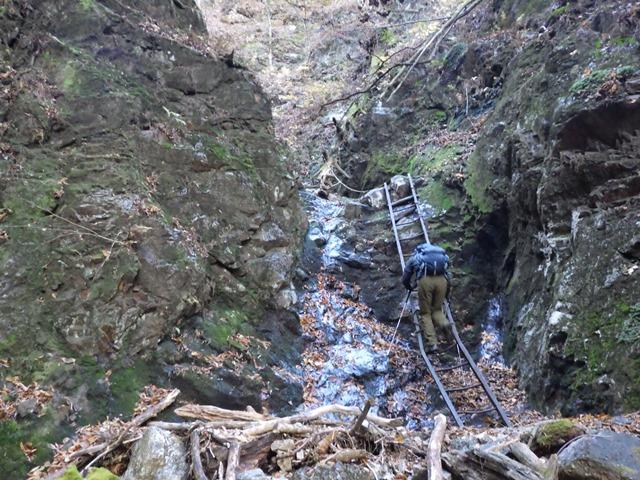 少しし進み滝の横にかかる鉄梯子を慎重に登り