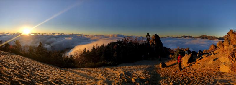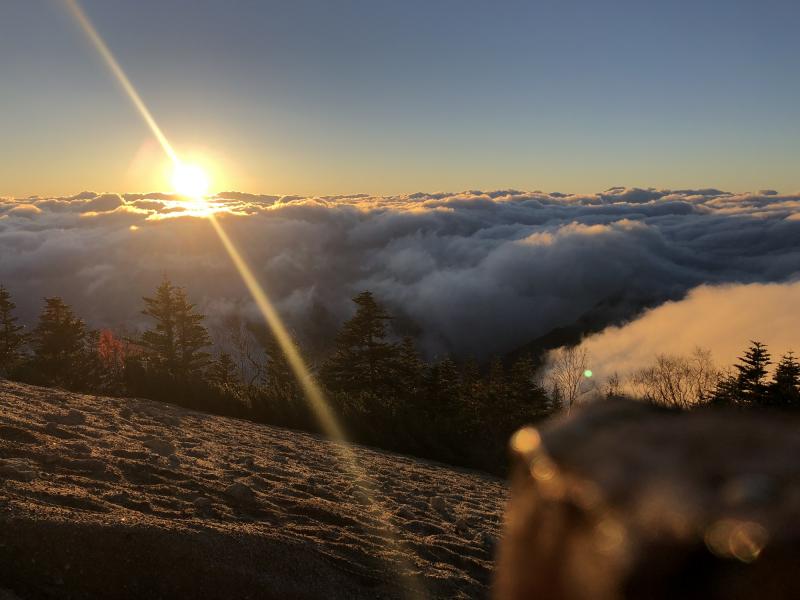 翌日も朝日の時間に合わせて登り始め、森林限界を超えた所で丁度朝日を迎える事ができました。