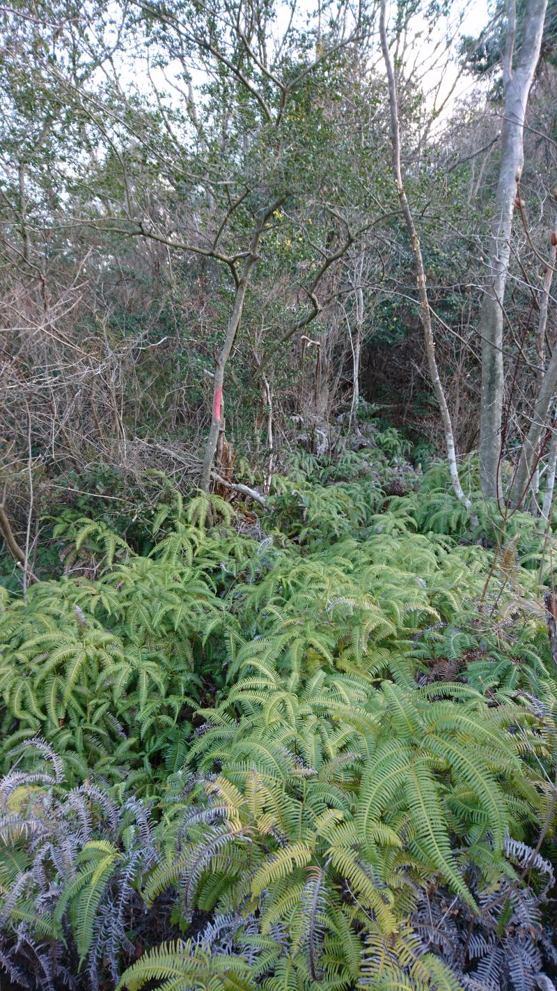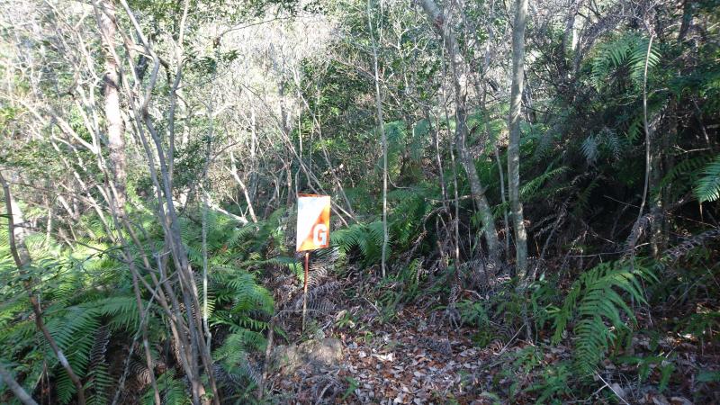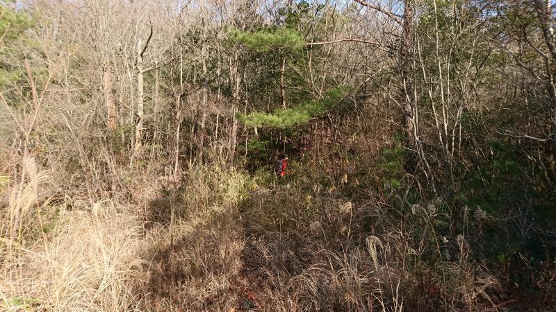 合流したら左側へ道沿いに歩き、目の前に見える稜線を登ります。その後稜線伝いに歩くと丁字路になるのでそれを左へ。しばらくするともう一度自衛隊の道と合流するのでそれを右へ。50mも行かないくらいで右前のススキ林の中に赤く塗られた木があるのでそちらへ針路を取ります。