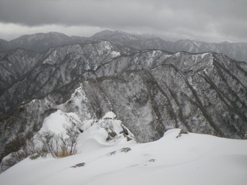2年前と違い、雪が少なく、下部はペースよく進みましたが、雲母峰分岐手前から雪も深くなり、ワカンを装着、岳峠トラバース~岳峠付近は結構、雪が深く、ワカンに変更しておいて正解でした。岳峠~鎌ヶ岳はルンゼを進みますが、ここもいつもながら雪が深かったです。今日は雪混じりで展望がいまいちかと思いきわ、御在所岳上空は視界がはっきり、雨乞岳方面はガスがでている感じでした。帰りに鎌尾根を少しだけ進んで、尖った三峰をどうやって通過するのかを確認しましたが、南から進んで来た場合はトラバースするのがわからず、懸垂してしまうかもしれません。三峰から先、細い稜線ですが、あまりナイフリッジ状になってはいませんでした。また時間のある時に鎌尾根を逆から歩きたいと思います。