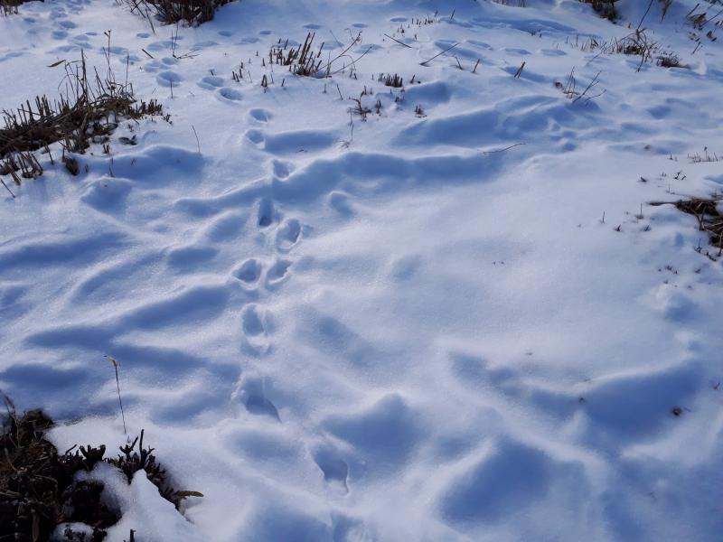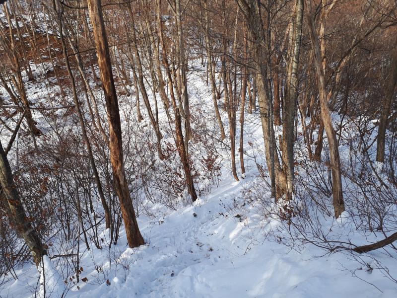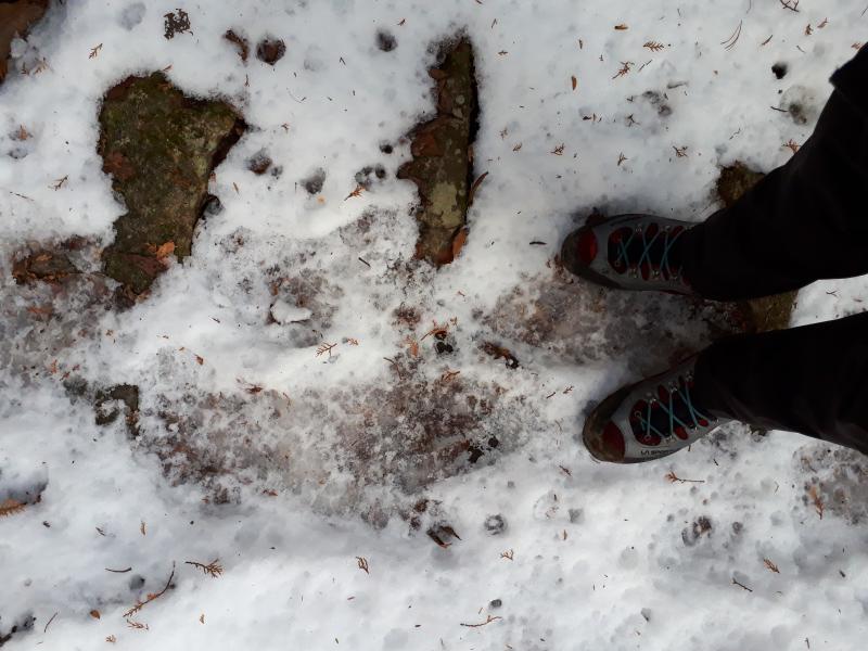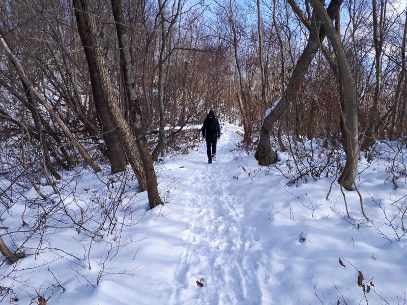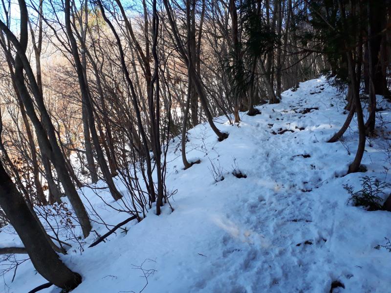 ・中間地点の尾根に出ると、積雪した所が出てくる。用意はしていたが、チェーンアイゼンは使用しなかった。