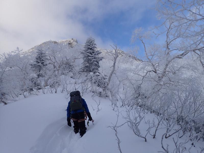 尾根上はラッセルで苦労したが樹林帯を抜けると締りのいい雪質