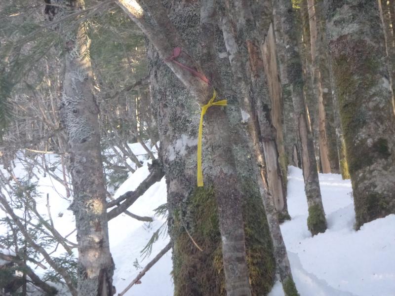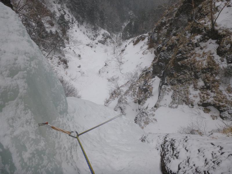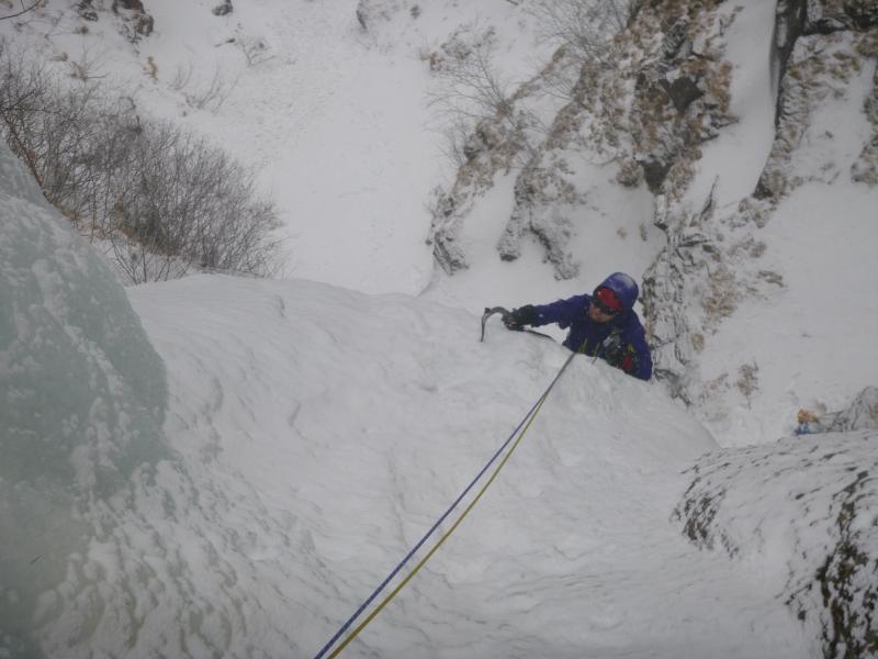 リード&フォローで登り、次は右のラインからもう1本登りたいところでしたが、入山時の天気予報だとこの日は南岸低気圧が通過の予報で、登り出しから降り始めた雪が次第に強くなってきたので帰ることに。