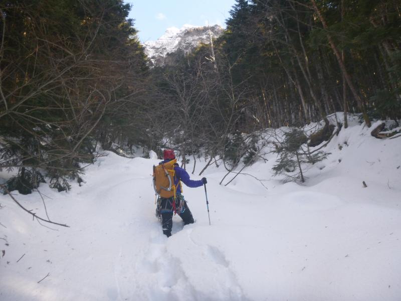 着いたのが昼頃と遅かったのでリード&フォローで1回登っただけで終了、行者小屋に向かう道すがら摩利支天大滝の偵察へ。