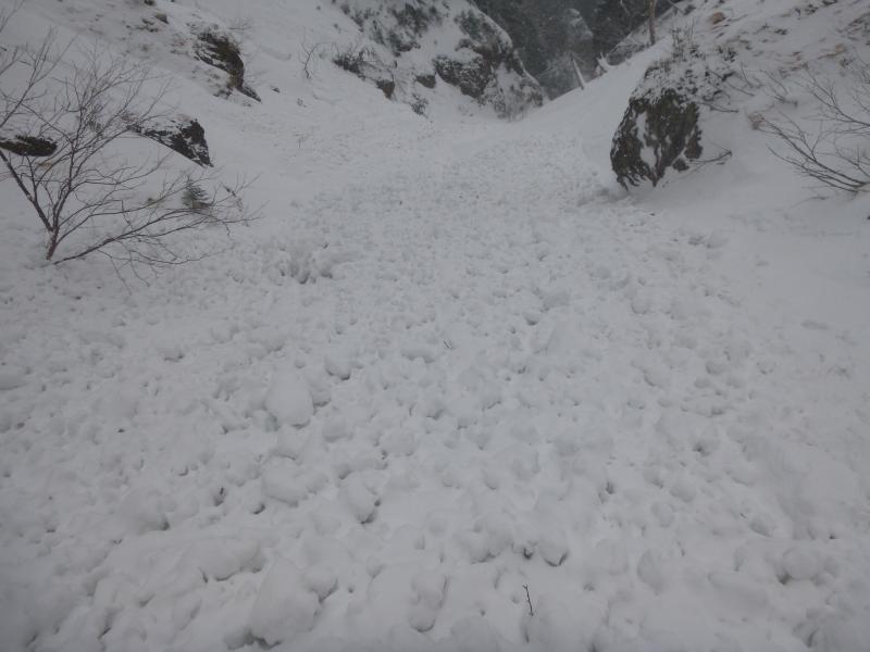 アプローチの大同心沢は2日前の昇温と降雨のものと思われるデブリが沢山ありました。
