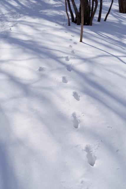 たくさんの動物の足跡。上りになりましたので、アイゼンを付けて歩いていきます。
