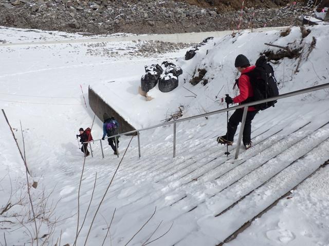 林道広場から圧雪された階段を注意して下り