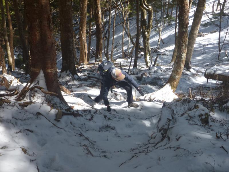 また、この時期は、深くはありませんがまだ雪が残っており、特に急登ではツルツルになっていて、登りも下りも難渋するので、少なくとも軽アイゼンは持っていった方がいいでしょう。アイゼンがないと、滑って木や岩にぶつかって危ないですし、時間もかかってしまいます。