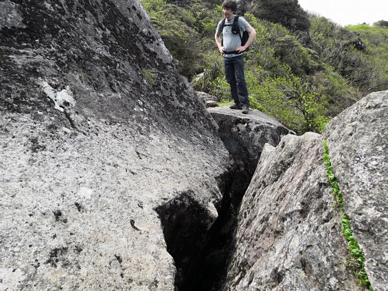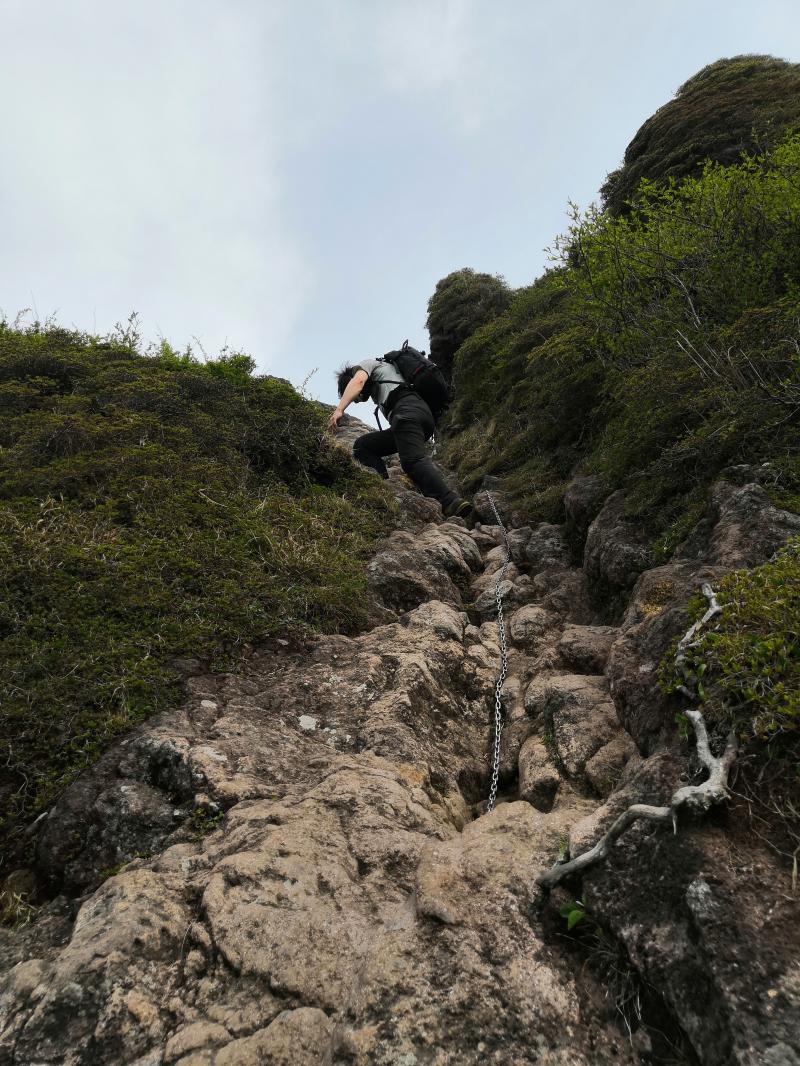岩場をトラバースする鎖場があります。西峰ピークまでの核心はここです。