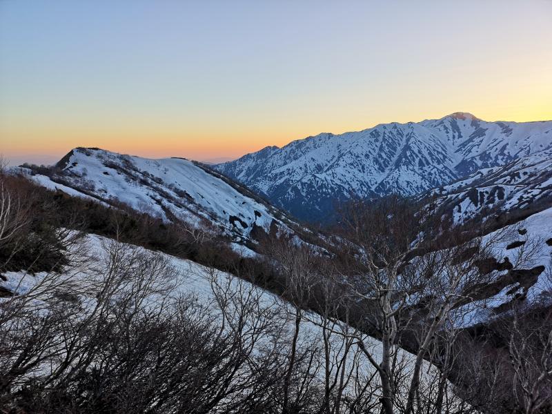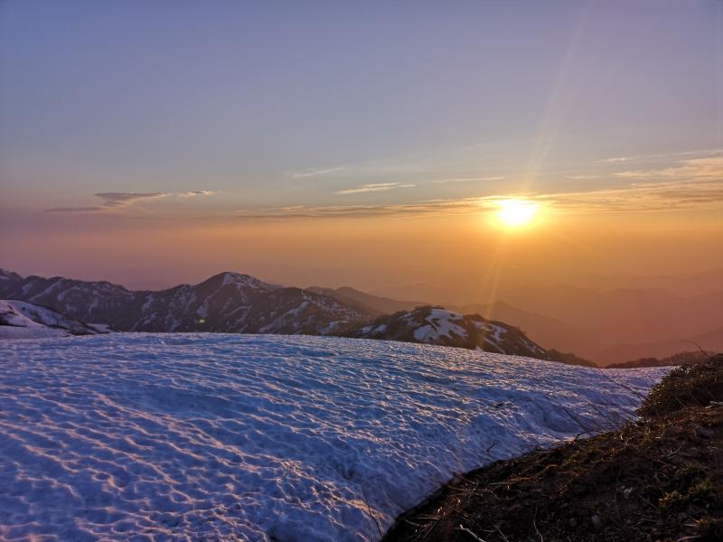 翌日も良いお天気、遠く蔵王から昇る朝日を眺めながらゆっくりと朝食をとり、切合に向けて歩き出しました。小屋からすぐに雪渓ロード、靴が良く刺さって梯子の場所までは軽快なツボ足で歩けます。梯子の下半分は埋まってたので脇の崖を慎重に登り、その先はカタクリの咲くわずかな夏道と雪渓とを交互に進みます。三国小屋が小さくなって種時山が近付いた頃、一ヶ所40°くらいの急な場所がありました。そからはアイゼン、ピッケルで30mくらい登ると雪の天辺に立ちました。
