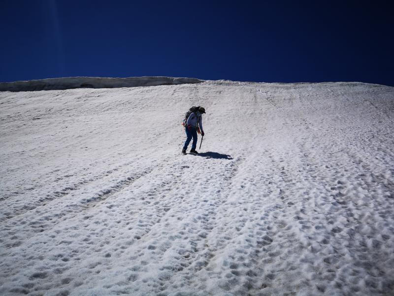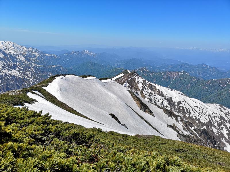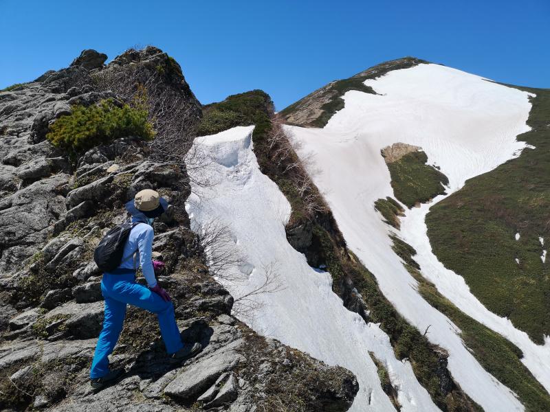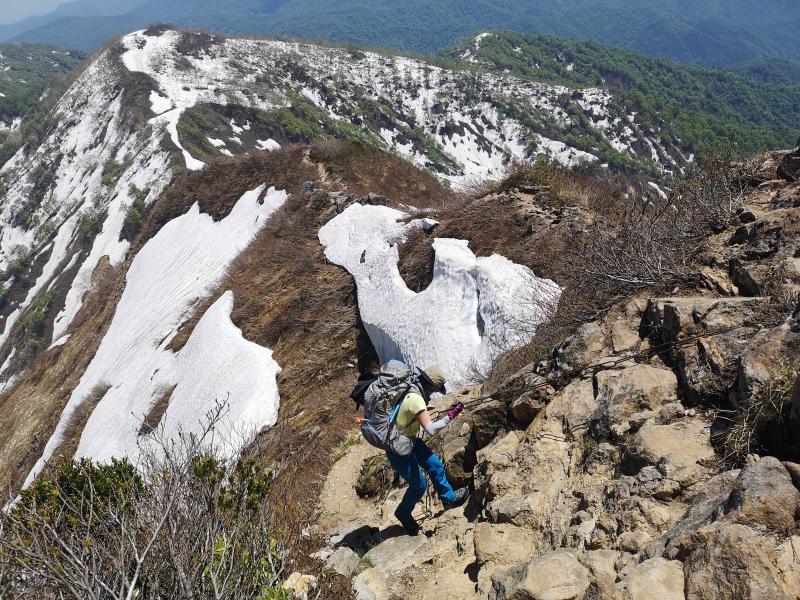 ・三国~切合、急傾斜の雪渓あるのでアイゼン、ピッケル必須です。夏道は3分の1くらいしか出てません。