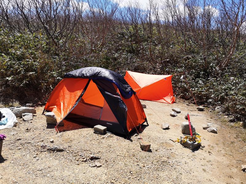 心配事も減ったし、今夜の宿のツエルトを意気揚々と設営。思ってたより上手く立てられたし、何より飯豊最高峰・大日を雄大に眺められる最高のテン場でした。小屋に泊まらず、しんどい思いをしてテン泊するのも大いにありだと思います。