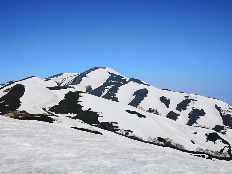 笹平に出て前方に地蔵のピーク、左手には赤茶けた剣ヶ峰と三国小屋を確認、岩に雪は無さそうなので一安心。アイゼンを着けてまずは地蔵山、見えているのに一向に近付かず、さらに上から下からの照り返しに息も絶え絶え、始めから巻いてしまえば良かったと、後悔しながら見上げた先に飯豊本山の山並が。ここからは草履塚に隠れて頂上は見えませんでしたが、神々しい姿に疲れた体がしゃんとなりました。