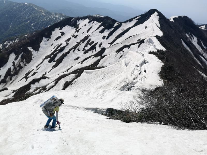 気をとりなおして剣ヶ峰へ。始めは雪道、徐々にリッジ状になり不安が過りましたが、その先は乾いて土が出ていました。大丈夫、いけるね!とアイゼンを外してよじ登るとまたしても雪。面倒だったのでストックだけピッケルに変えてツボで蹴りこみながら登りました。すると今度はわずか3mのかなり急な雪渓。アイゼン装着を惜しんで高巻きしたため足下の脆い場所を藪漕ぎするはめに。素直にアイゼンを着けた方が早かった気がします。同じようなシーンを何度か繰り返しようやく三国小屋へ到着。この先もきっと雪と藪との格闘、あと2時間頑張る気力が残ってなかったので、今夜の宿はここに決めました。