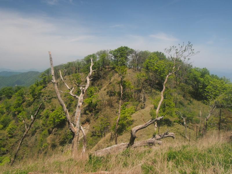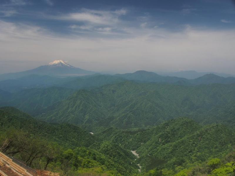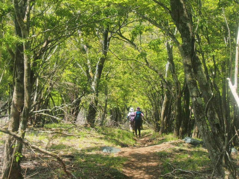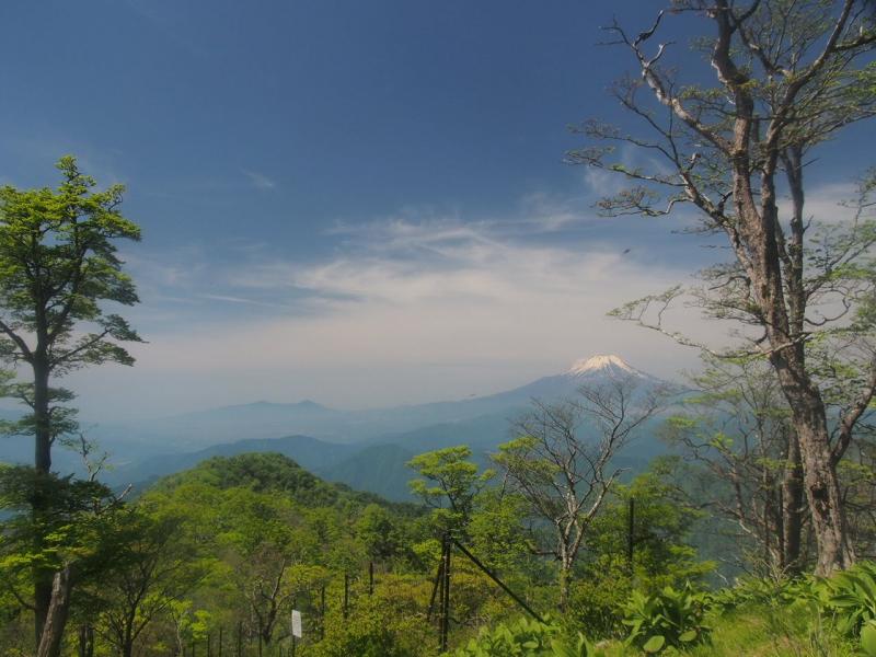 檜洞丸まではたくさんの人で山頂周辺もいっぱいでしたが、犬越路方面へ行くと人はかなり少なくなり静かな山歩きが楽しめます。富士山を見ながら、心地よい涼しい風に吹かれて下ったり登ったり。熊笹ノ峰からは結構な急坂。山岳部かワンダーフォーゲル部の学生がいっぱい登ってきていました。犬越路から大室山方面へは登り返し。ミツバツツジと新緑に癒されながらもここが地味に辛くなかなか長いです。。。