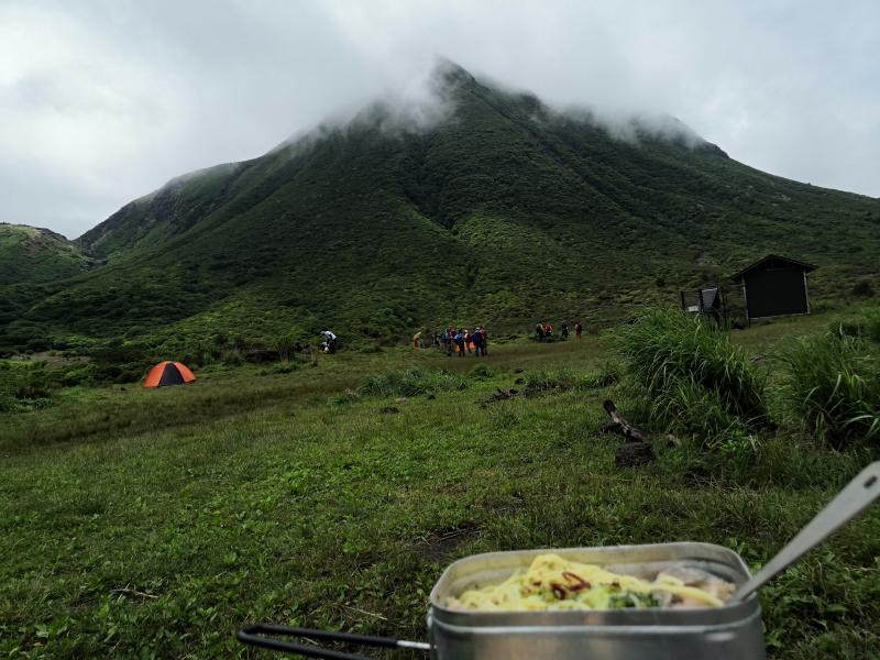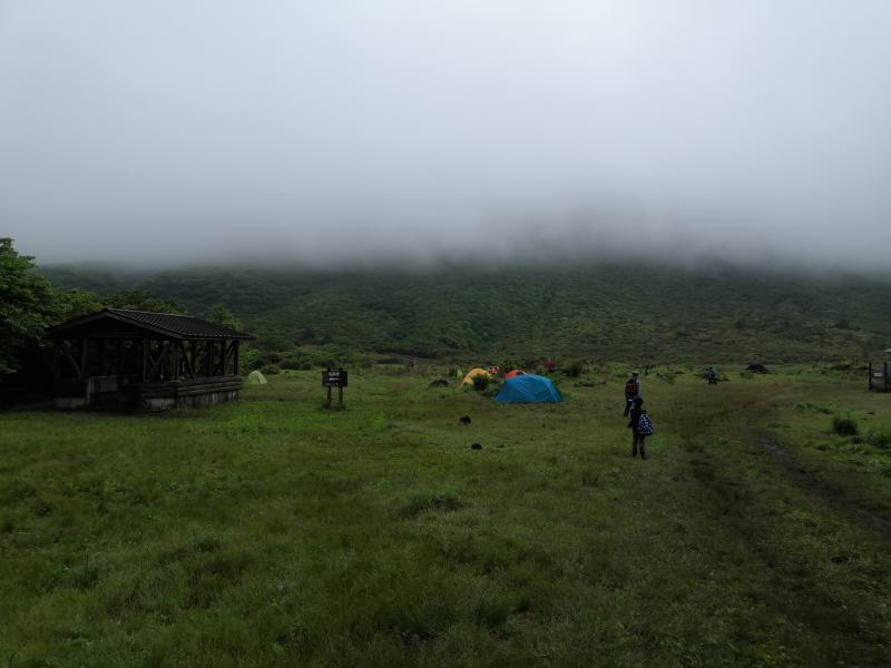 下山途中に天気が少し良くなったので坊ガツルまで戻り、三俣山のすそ野を眺めながら山ごはん。行きよりテントも増えましたが、さすがに悪天だったのでまばらでした。