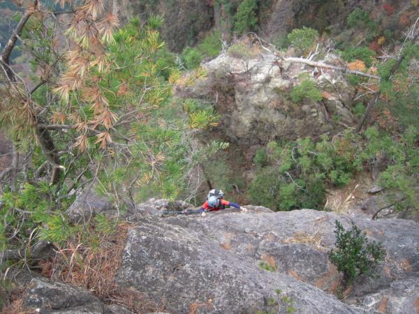 1ピッチ目をリードで行かせてもらうことになり、取付き点でセルフビレイ、支点の作り方などおさらいです。