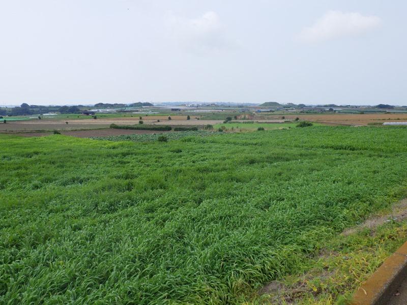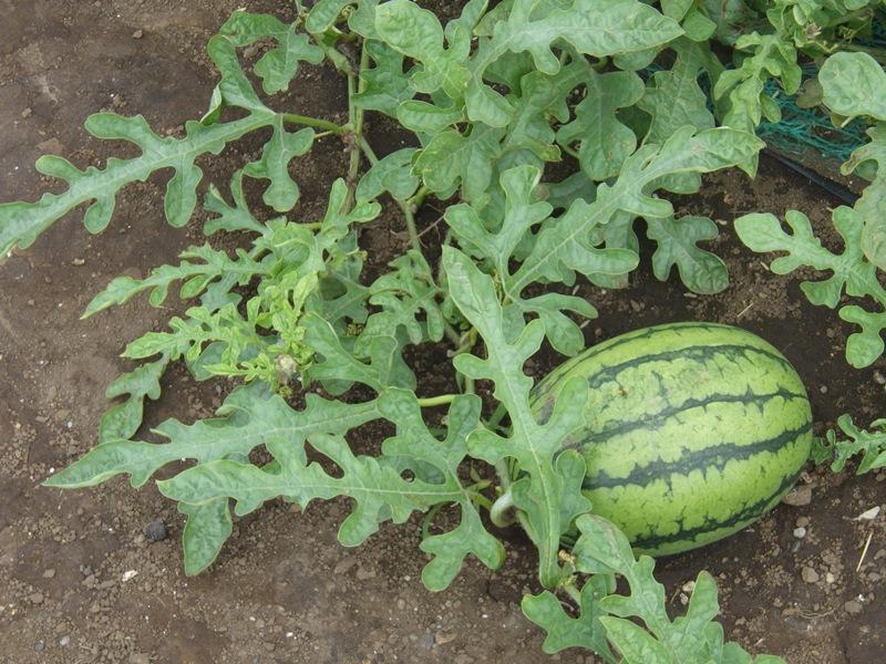 キャベツ、スイカ、カボチャなどの畑の中を歩き
